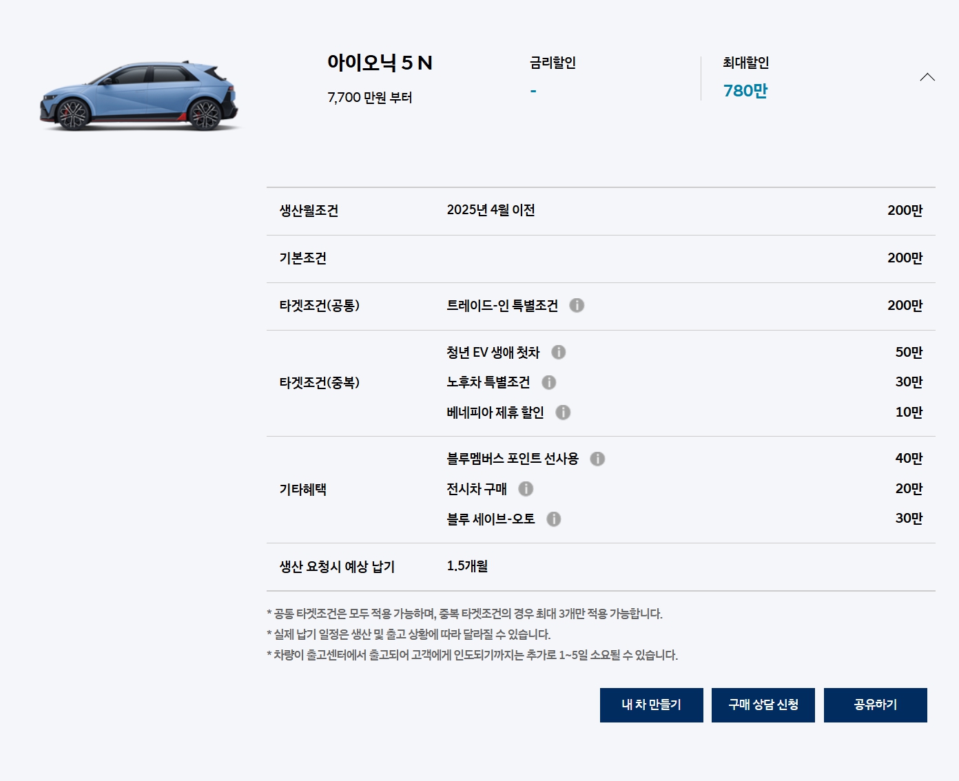 특이하게도, 아이오닉 5N은 재고할인이 200만원 더 붙는데, 아반떼 N도 그렇고, 이번 달은 N모델 사기 좋은 달인가 봅니다.