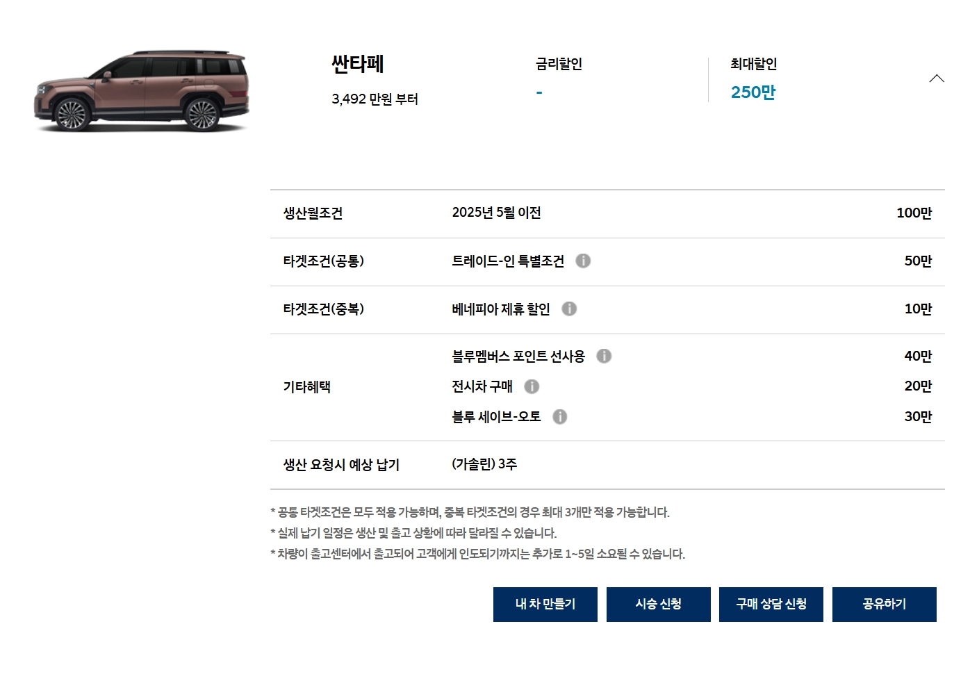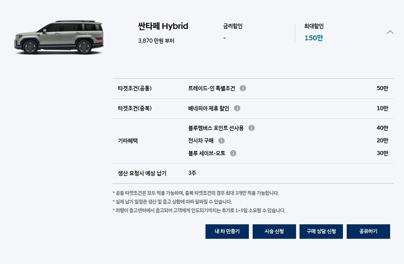 그랜저와 함께 종종 쏠쏠한 할인을 했던 차종이 싼타페인데, 이번 달은 가솔린 모델만 재고할인 100만원이 있고, 싼타페 하이브리드는 할인이 없습니다.