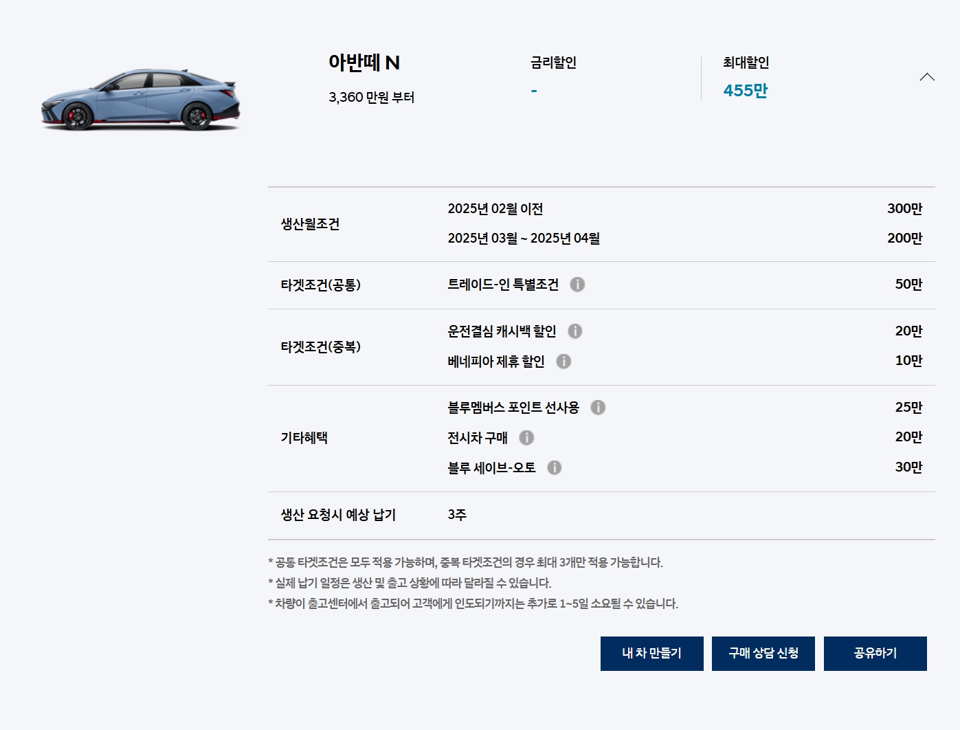 아반떼 기본형은 할인이 없고, 의외로 아반떼 N 재고할인이 매우 좋은 편입니다.