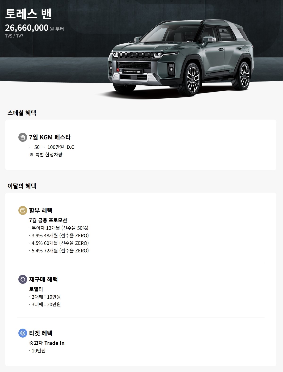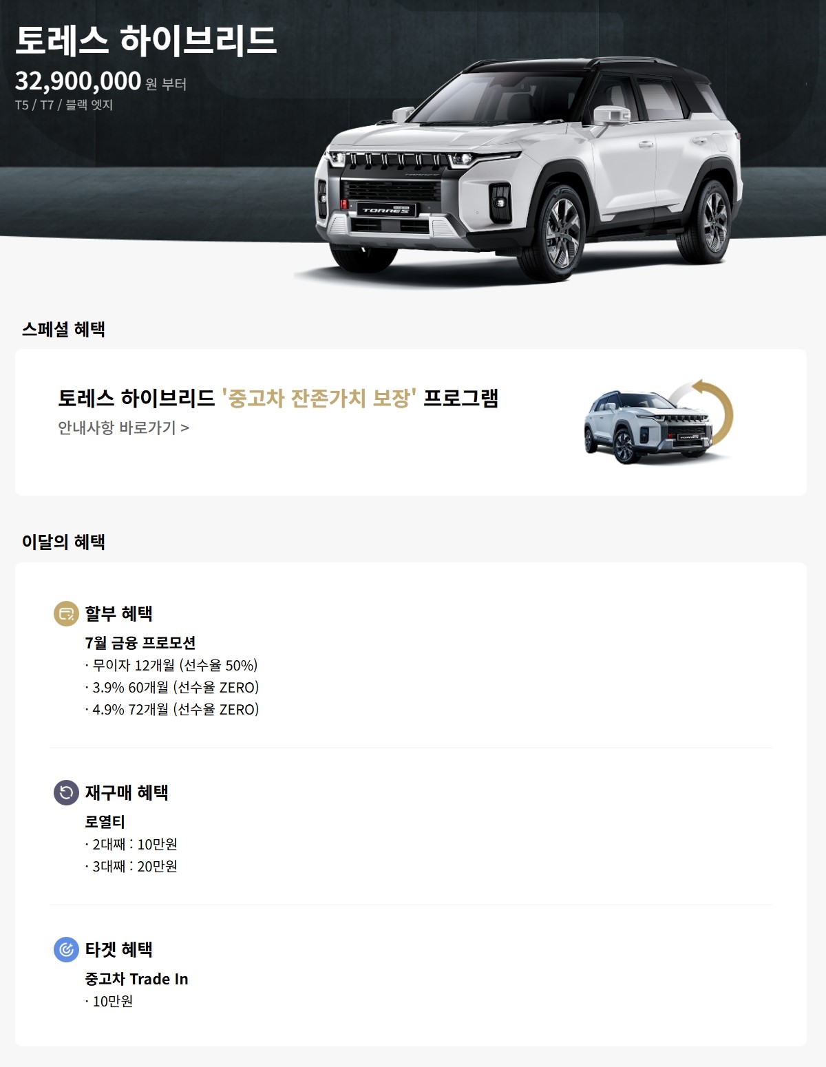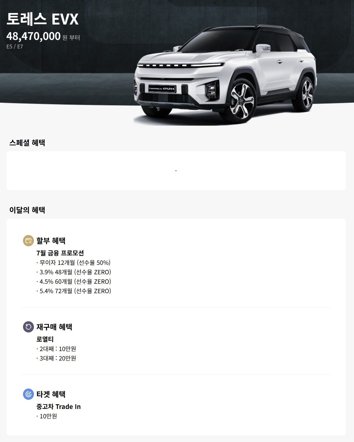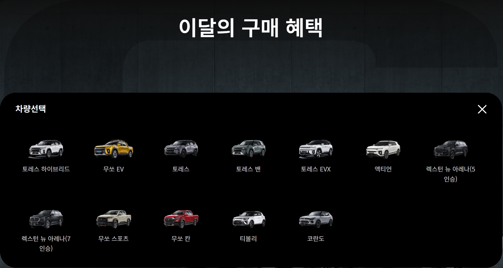 전기차 모델인 토레스 EVX 로, 예전에는 할인이 종종 있었으나, EVX 알파 출시 이후 프로모션이 없는 경우가 많습니다.