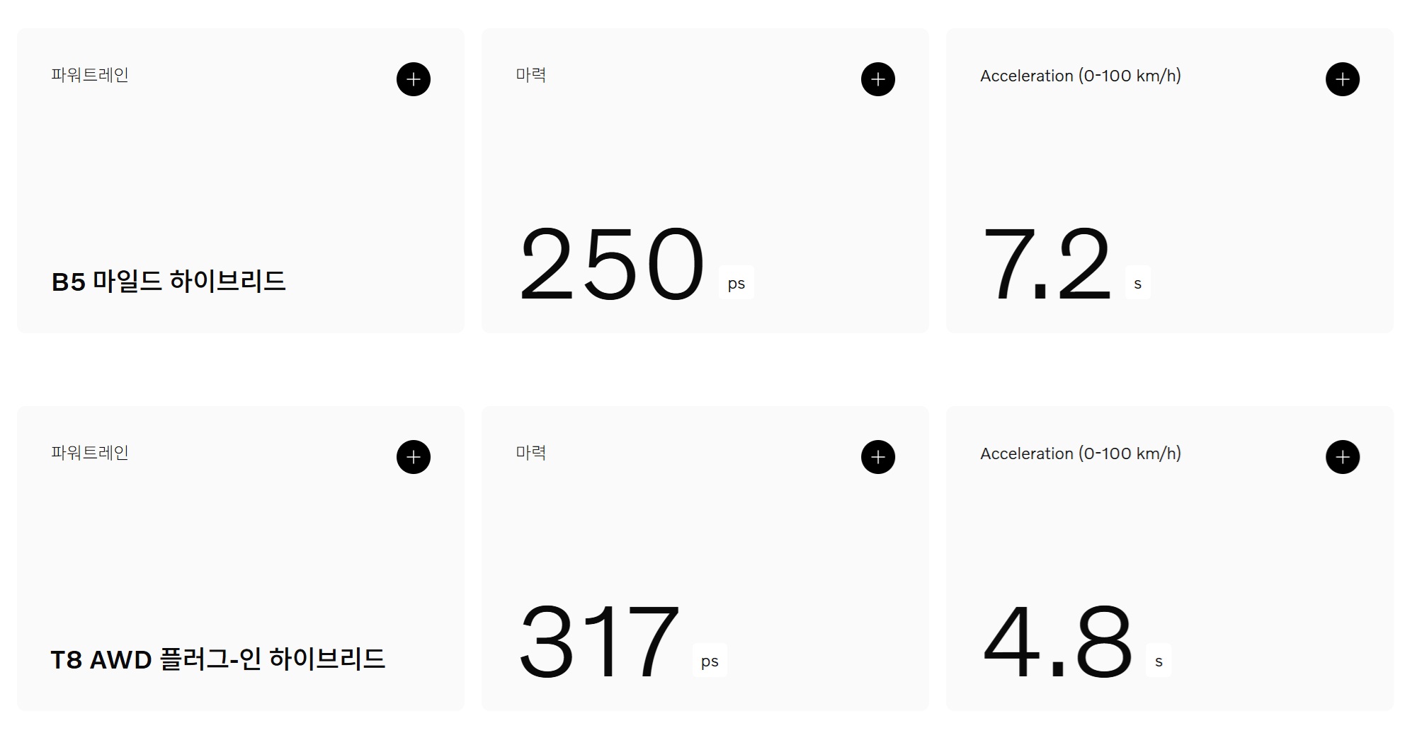 B5와 T8은 비교하기에 너무 많은 성능 차이가 나기도 하고, 마일드 하이브리드와 플러그인 하이브리드를 직접 비교하기는 그러니까요.