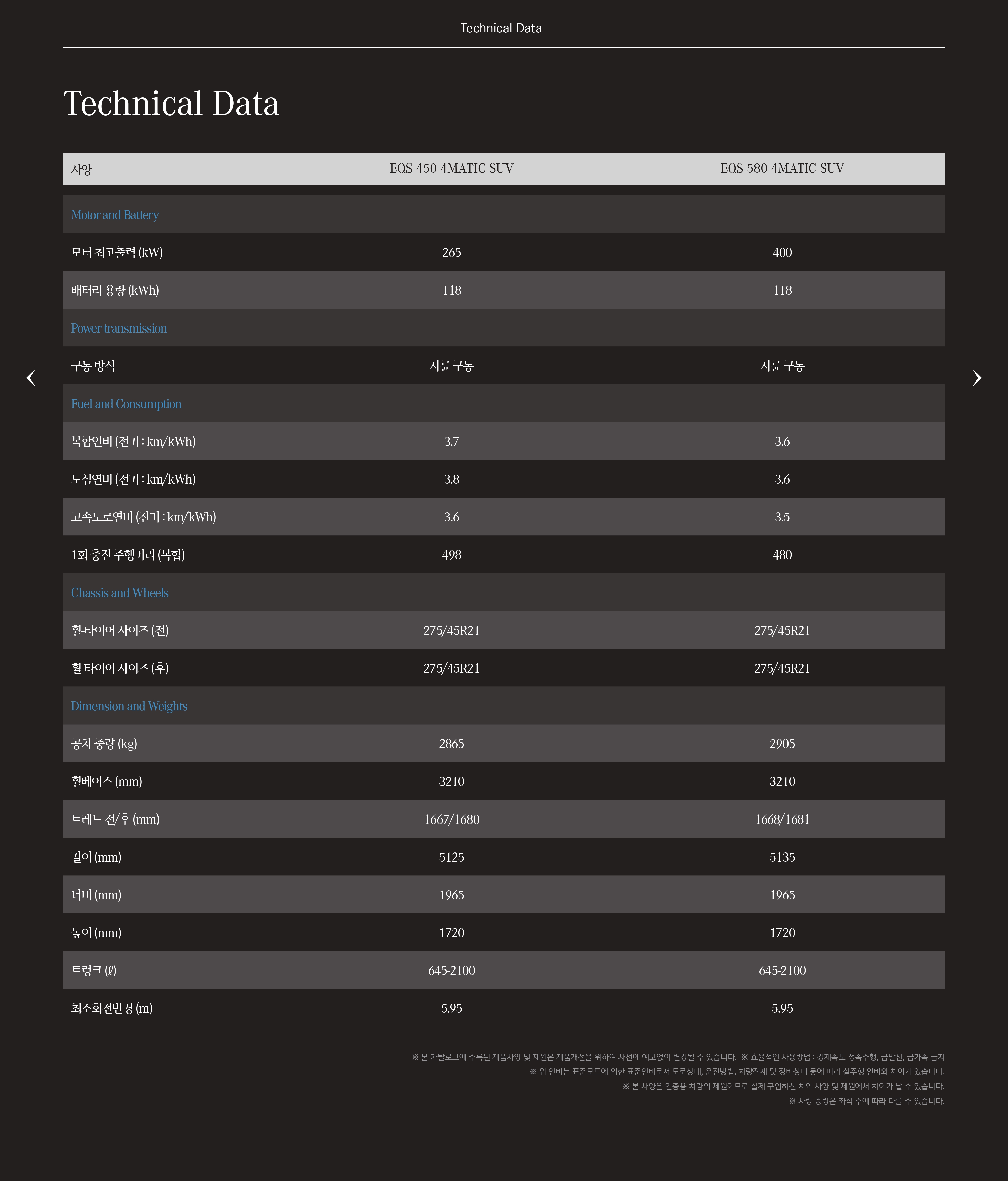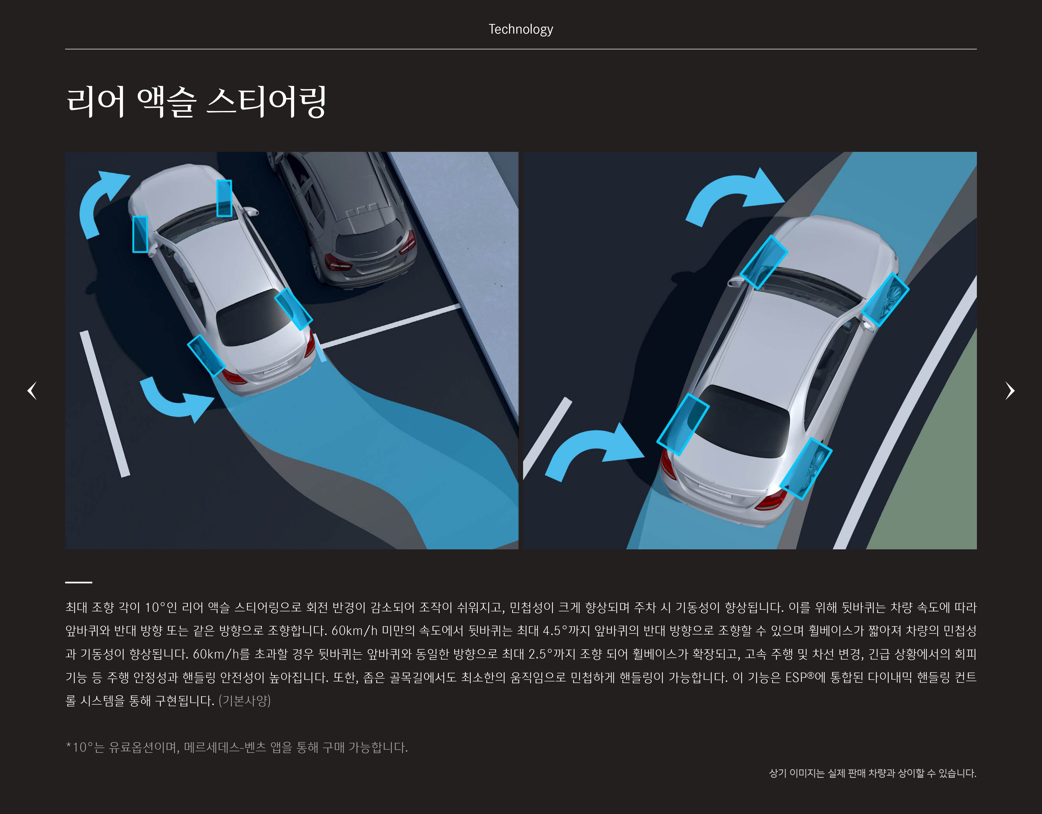참고로, 이미지만 보면 리어 액슬 스티어링은 EQS 580만 적용되는 것처럼 보이지만, 실제는 기본적용사양이라, 두 모델 전부 장착됩니다.