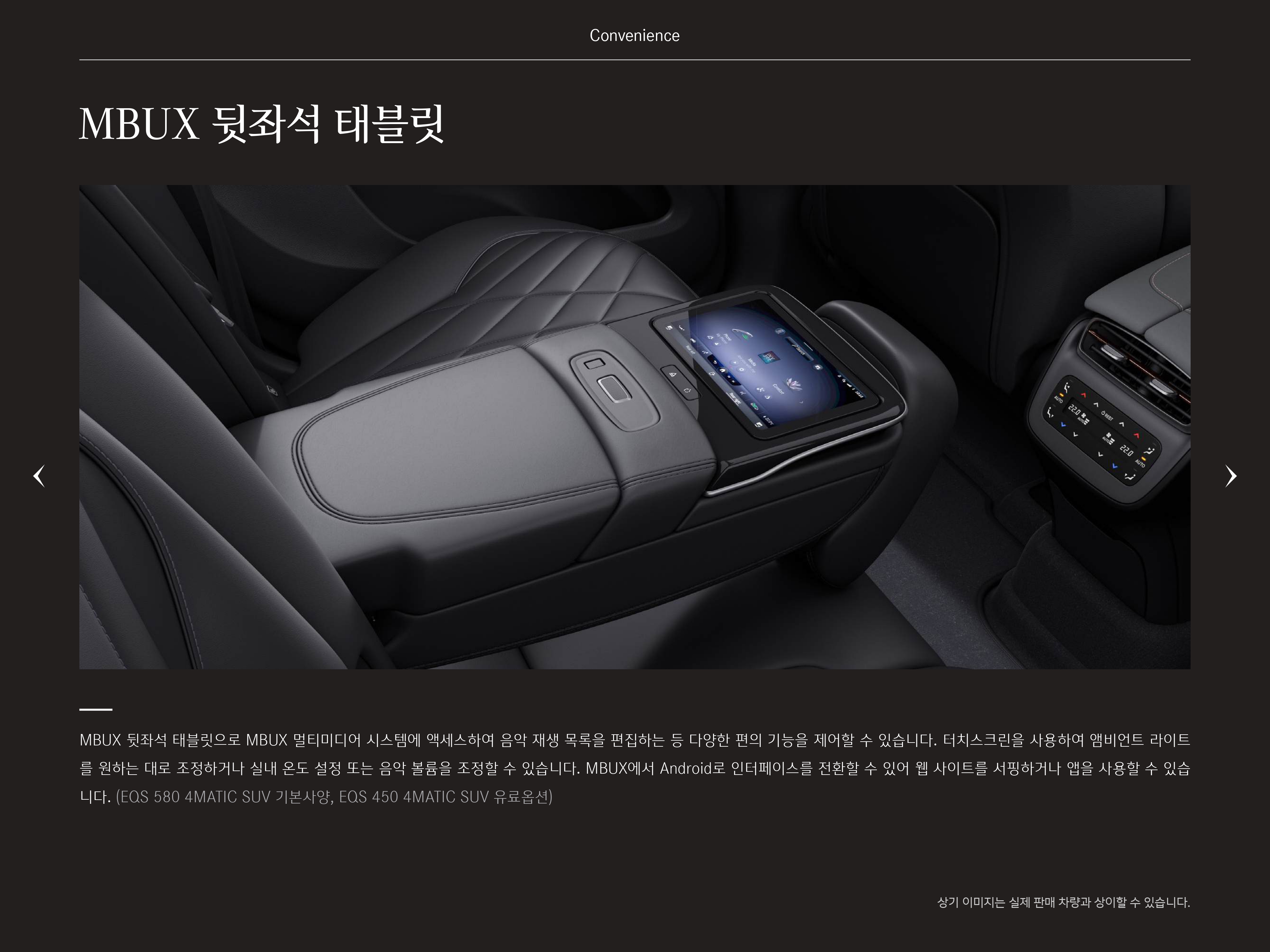 당연한 얘기지만, MBUX 뒷좌석 태블릿 또한 EQS 580 SUV 에만 기본 탑재가 됩니다.