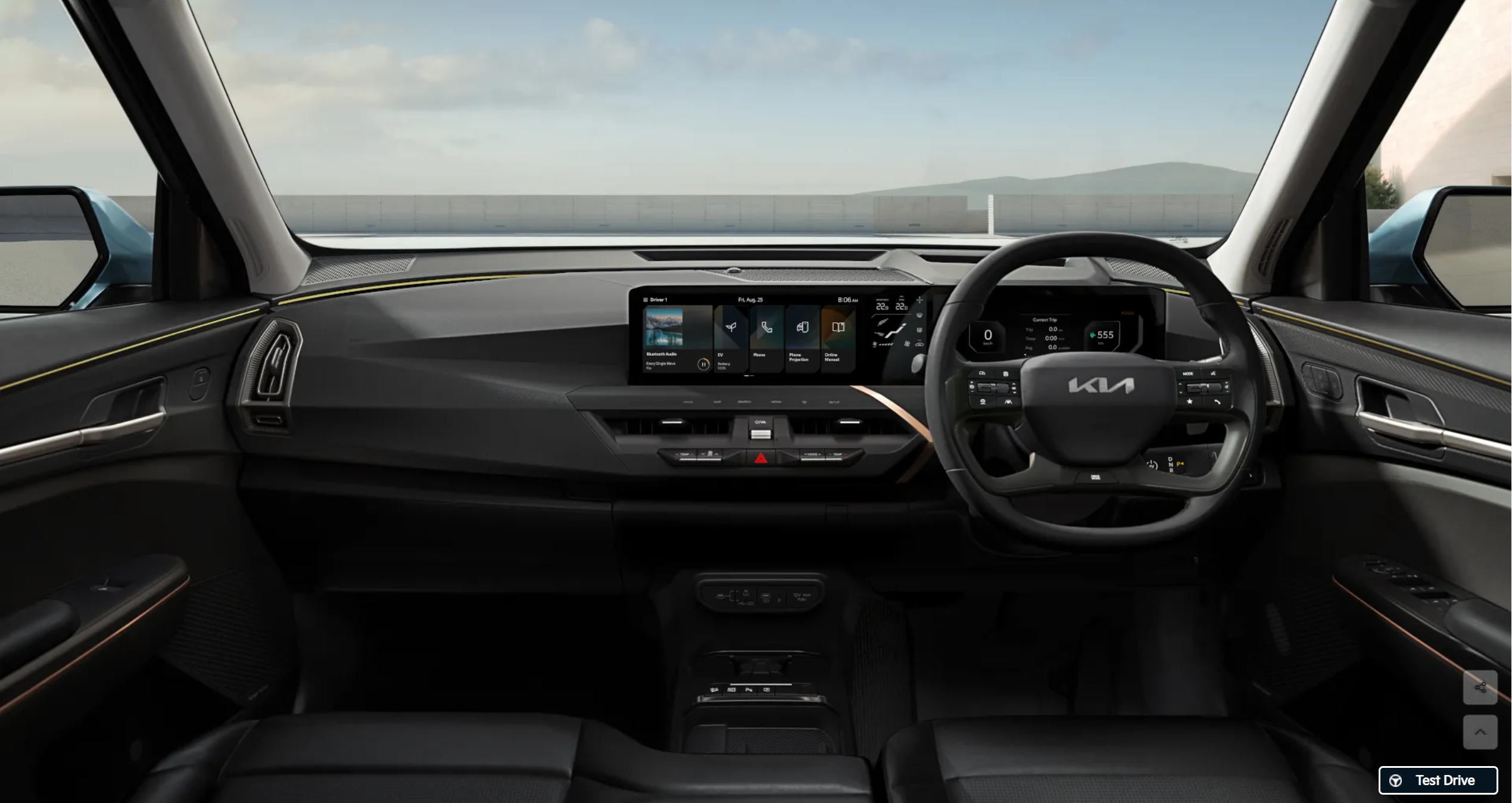 GT-라인의 경우, 스티어링 휠 디자인이 일반형 EV5와 다릅니다. 스포티 디자인의 정석 3스포크 + D컷이 적용된 것을 볼 수 있습니다.