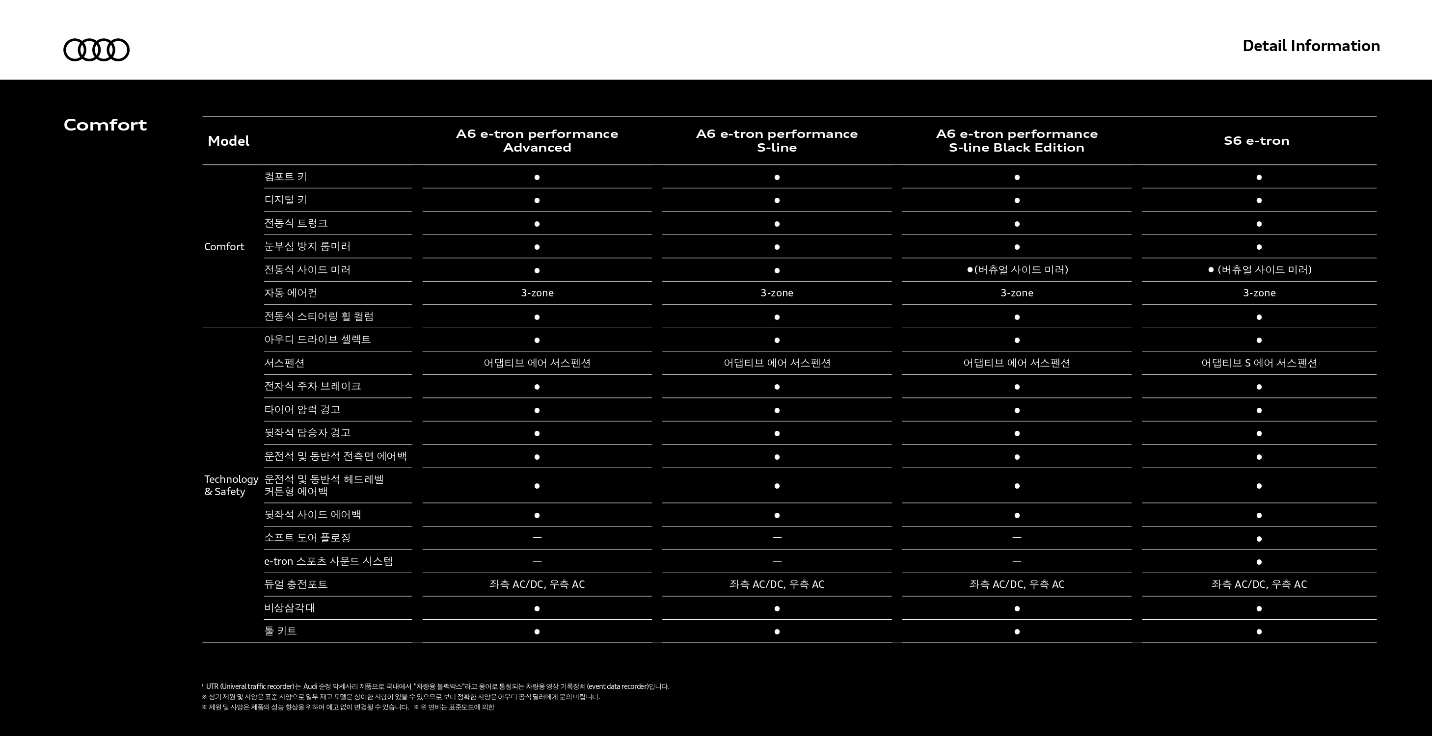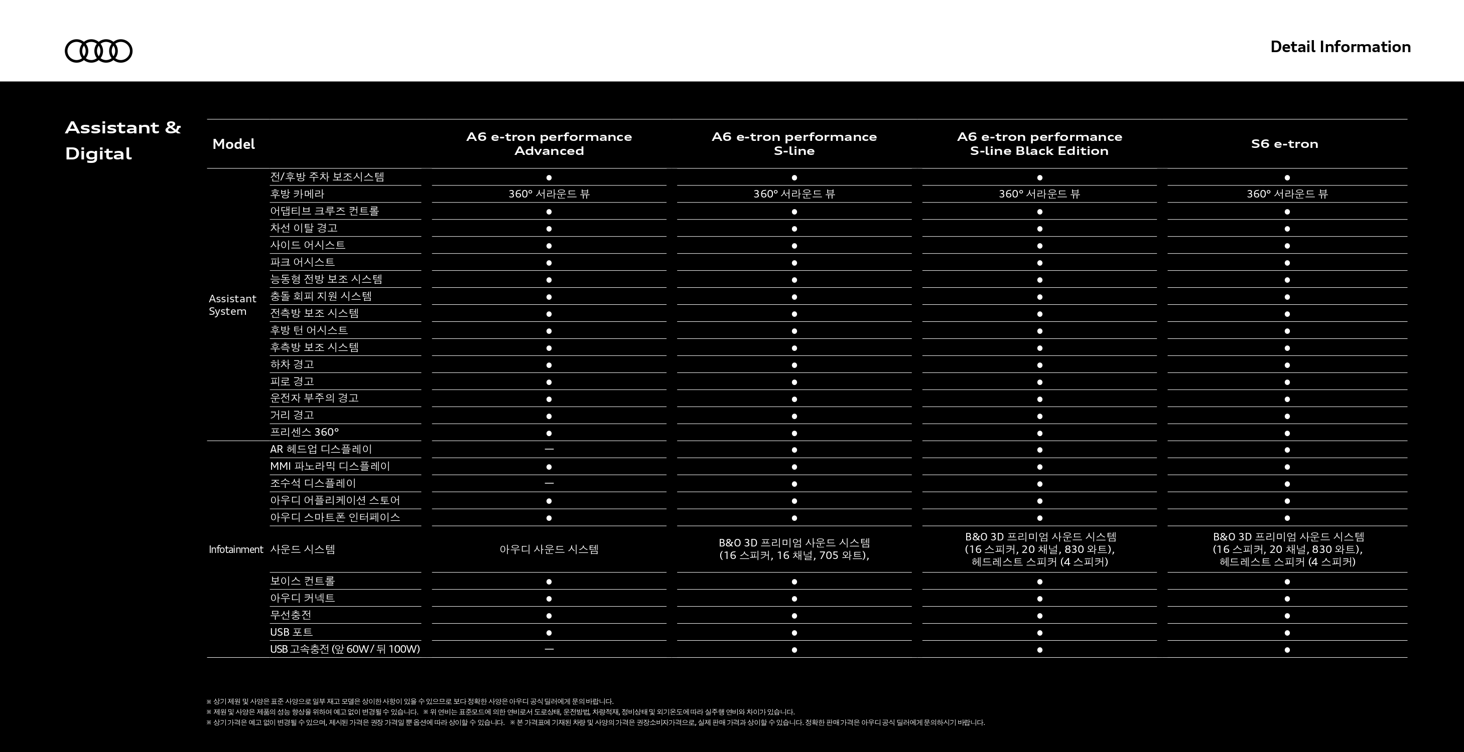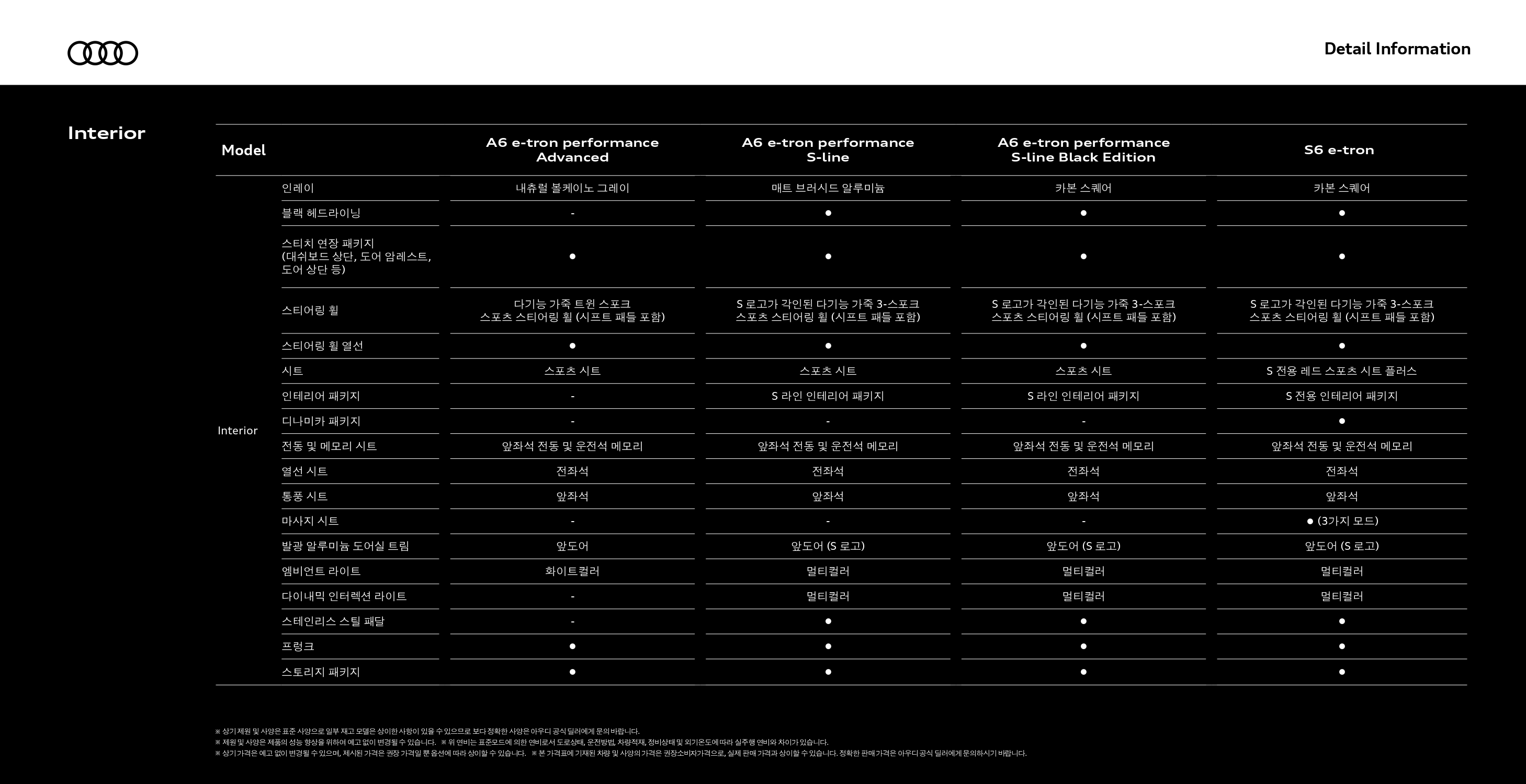 S6 e-트론을 제외하고 나면, 일반 A6 e-트론 세 가지 트림은 옵션에 따른 가격 차이이기 때문에, 옵션표를 유심히 잘 살펴보셔야 합니다.