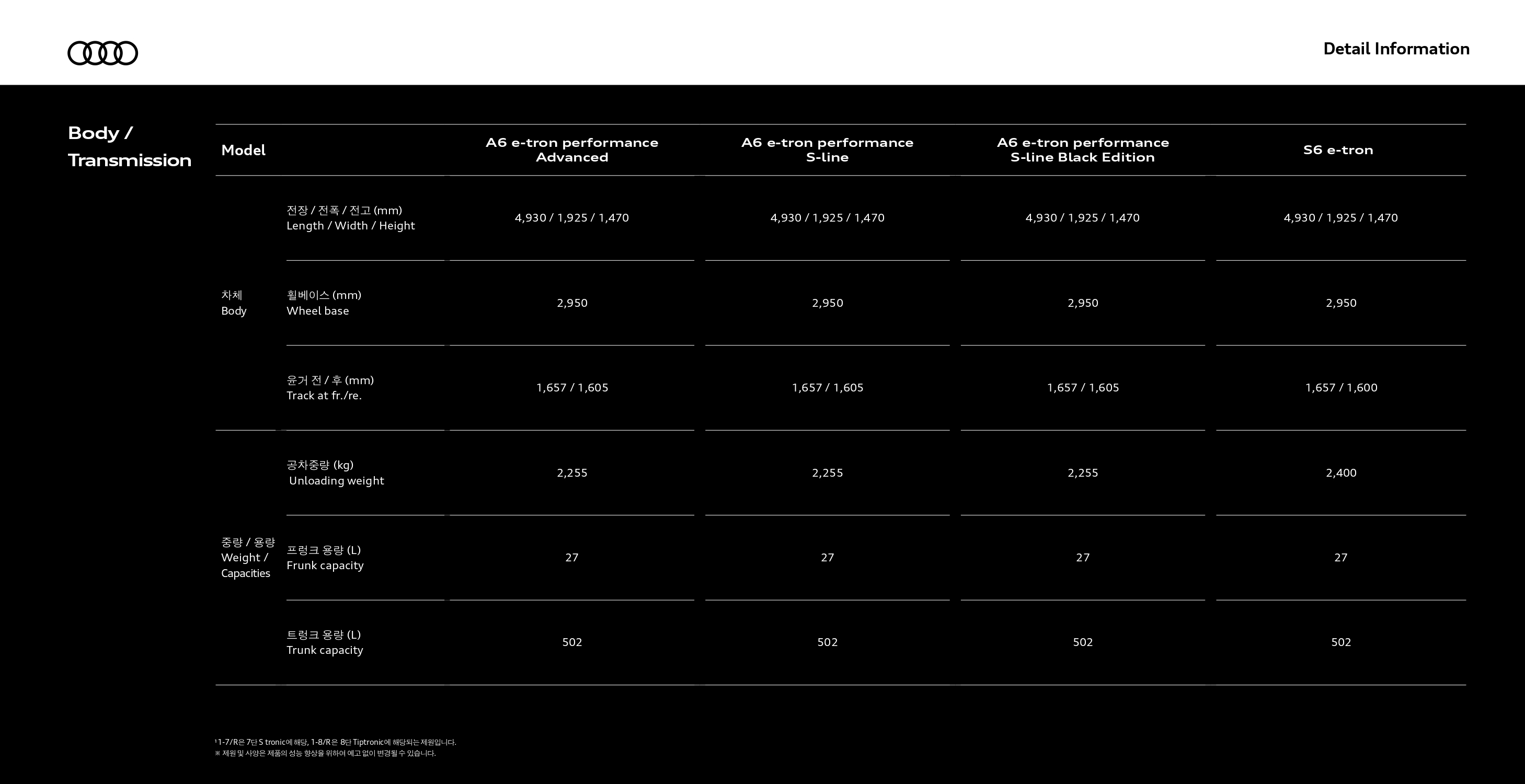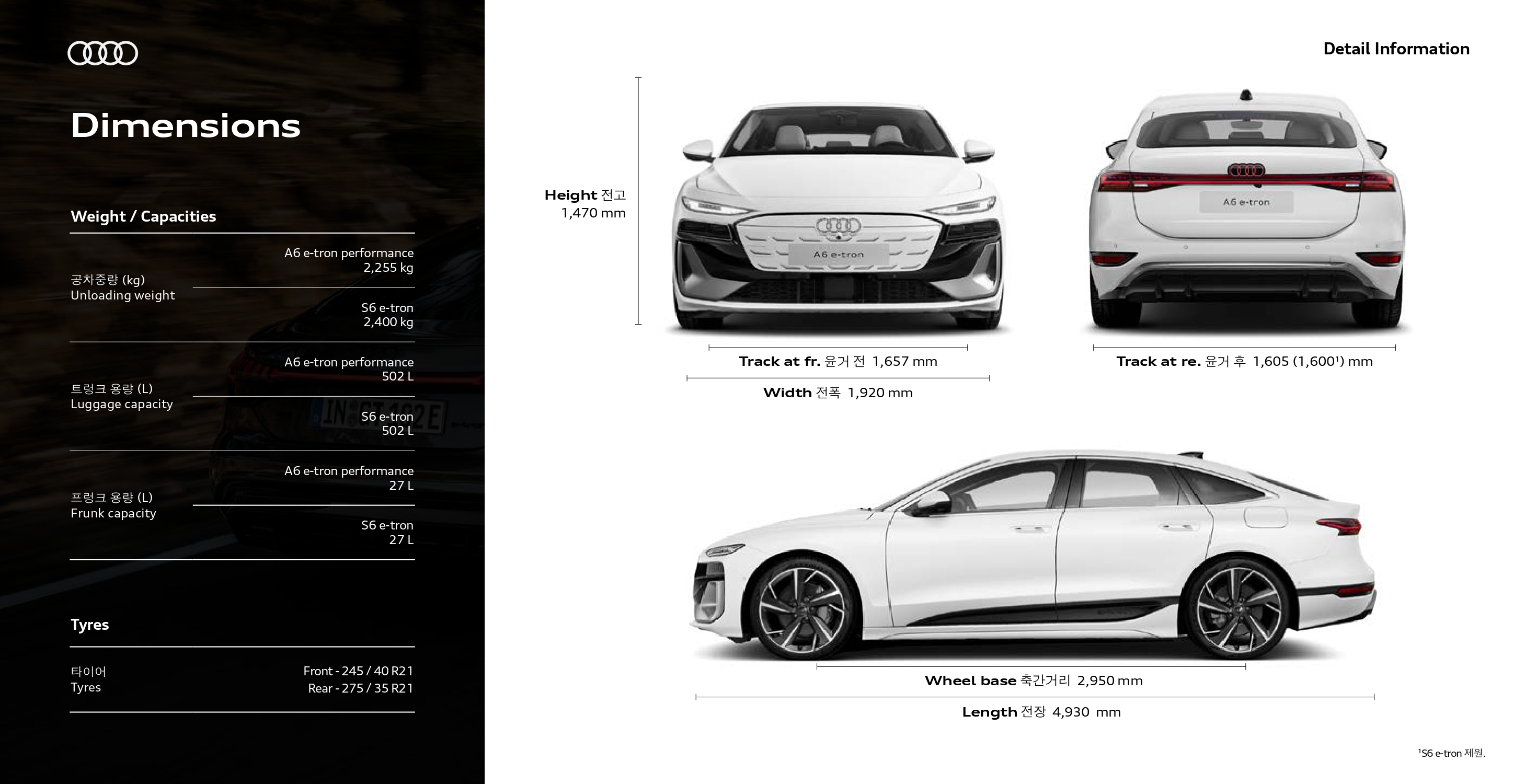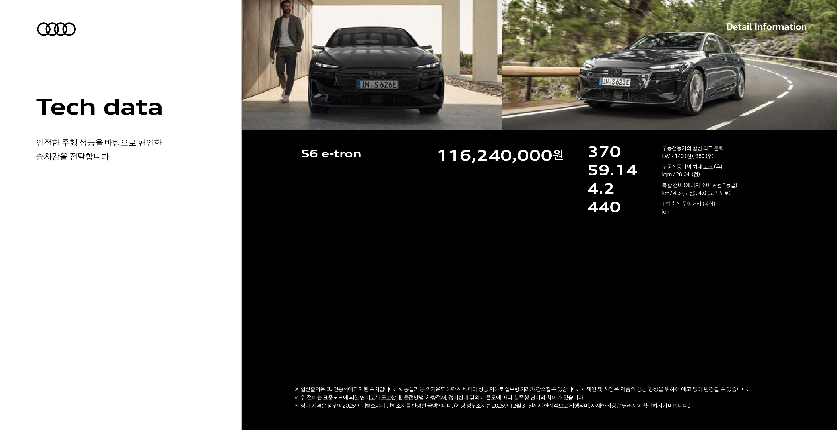 이번에 국내 출시한 사양은 270kW 싱글 모터 사양의 A6 e-트론, 370kW 듀얼 모터 사양의 S6 e-트론 두 가지로 출시하였습니다.