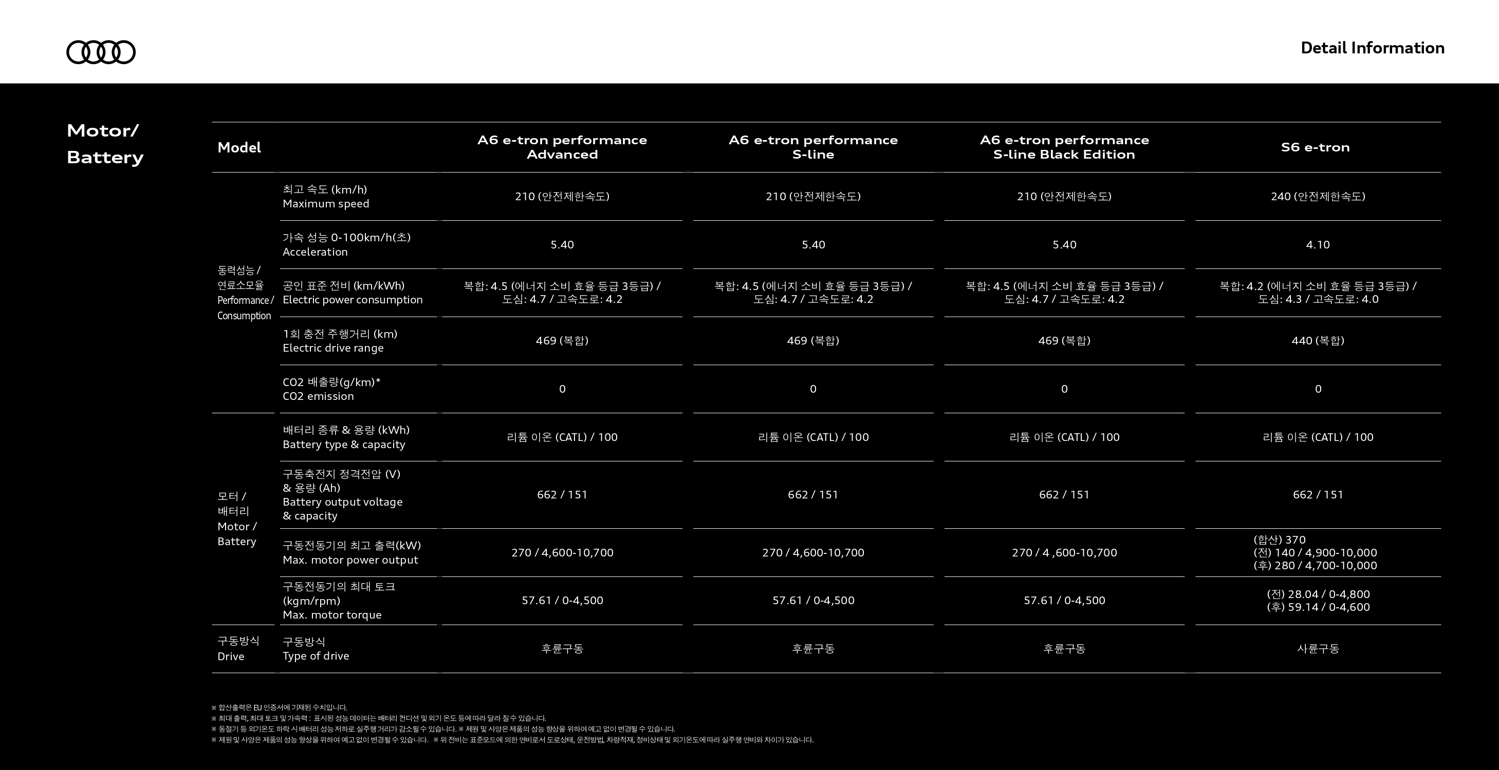 앞서 말씀드린 것처럼, A6 e-트론 세 차종은 동일한 파워트레인을 사용하기에, A6 vs S6 위주로 비교해 보시면 되겠습니다.