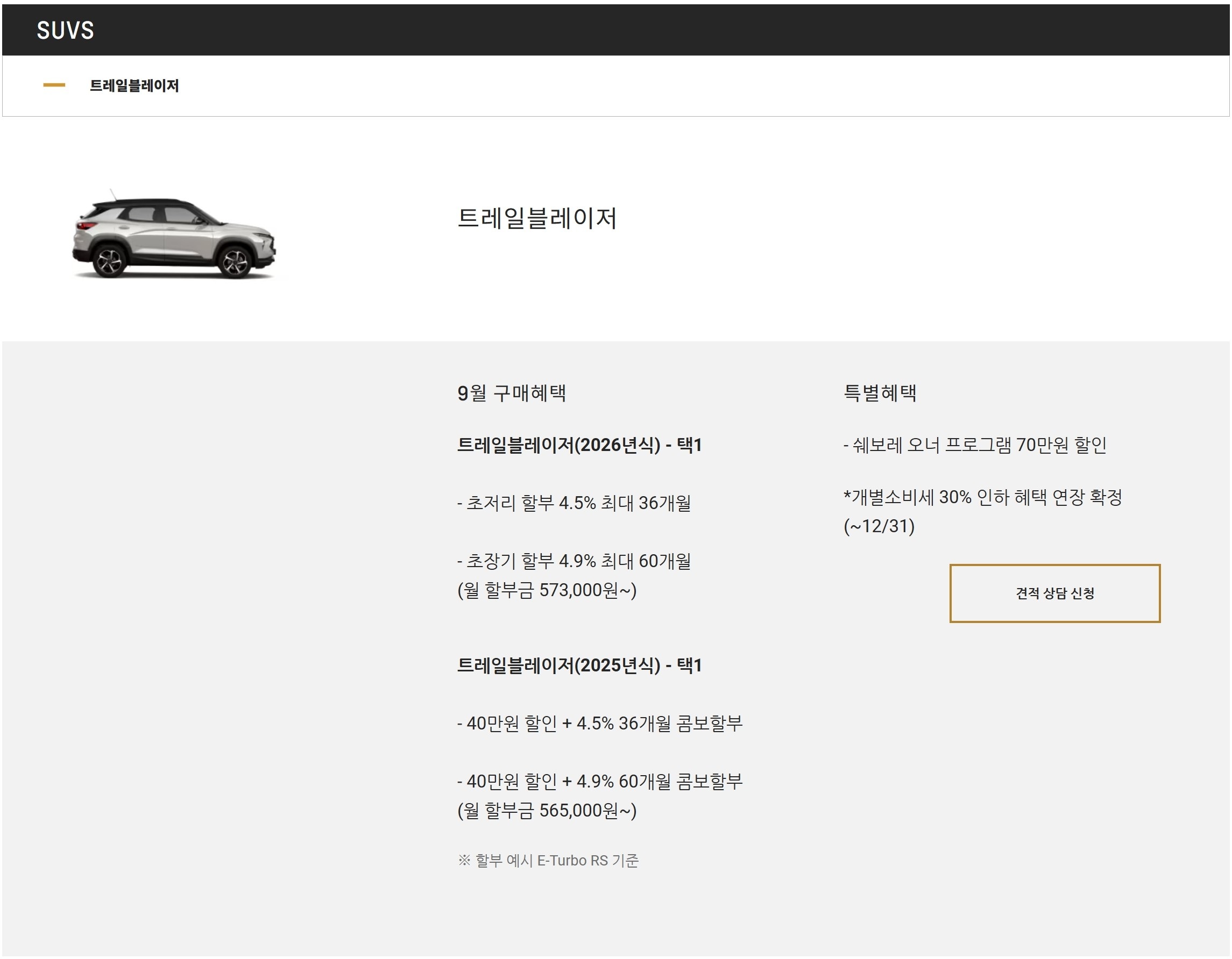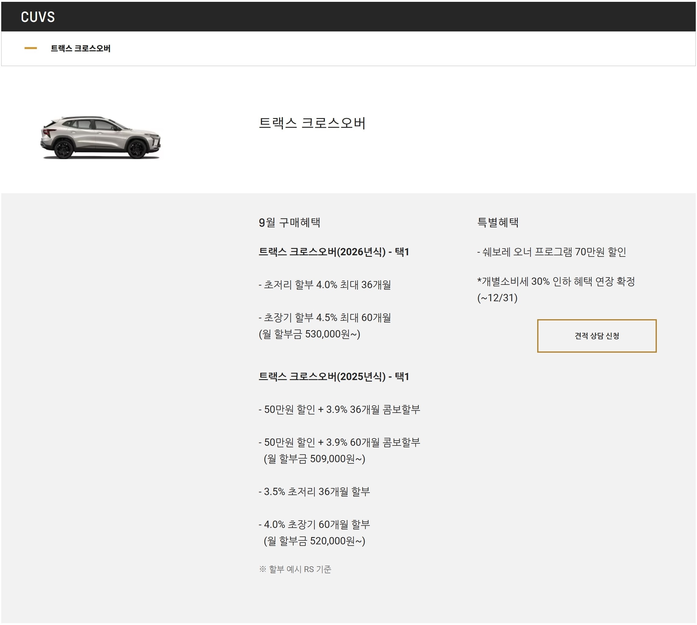 26년식 및 25년식 모두 할부 이율이 트랙스보다 비싸고, 현금 지원도 적습니다.