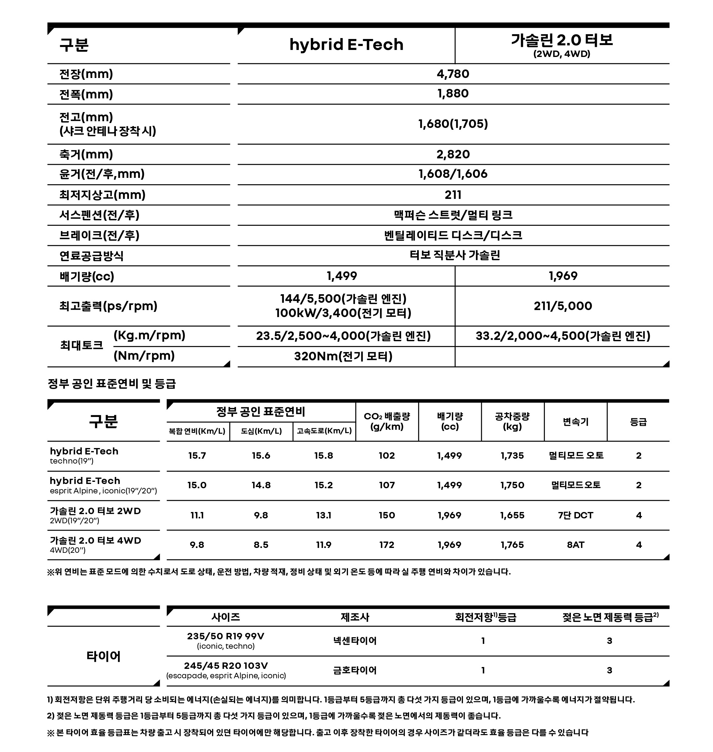 마지막으로 2026 르노 그랑콜레오스 제원인데, 파워트레인이 바뀐 건 없어서 제원은 그대로입니다.