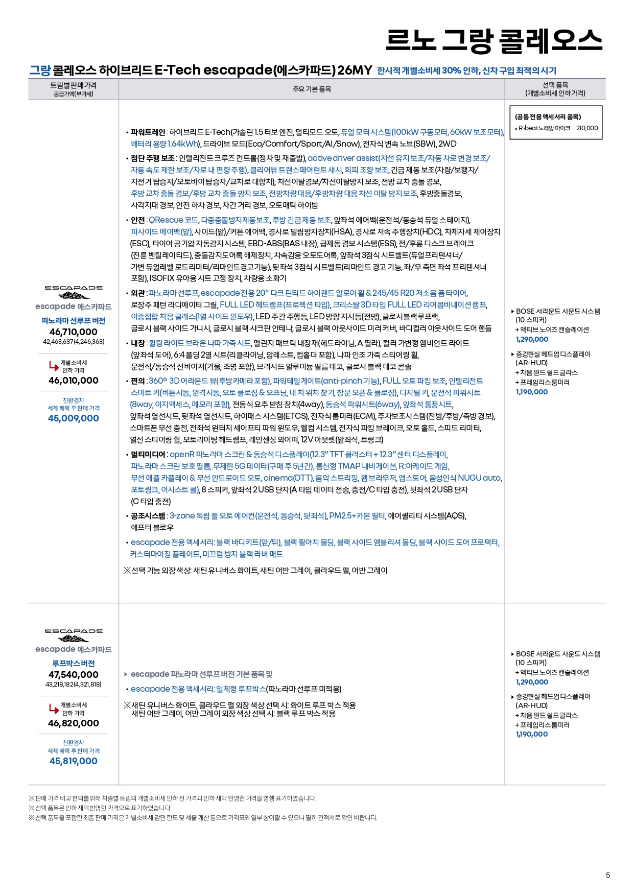 ▼ 그랑 콜레오스 하이브리드 에스카파드 가격표 ▼