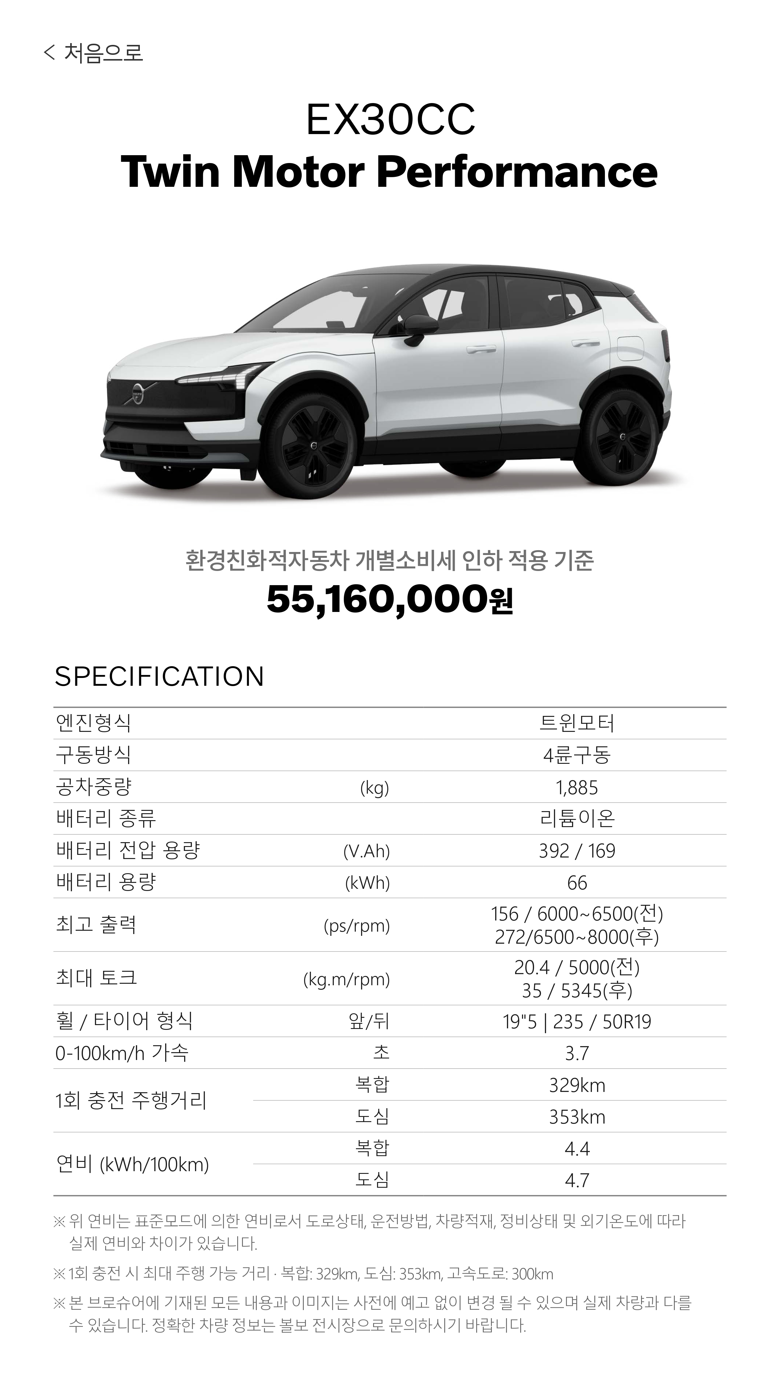 브로슈어가 EX30 일반형과 크로스 컨트리가 분리되어 있어, 한 번에 비교는 살짝 어렵긴 합니다.