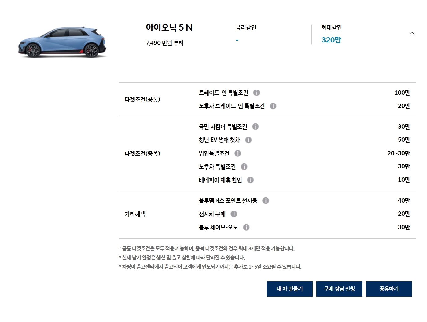 아이오닉 5N은 재고가 소진되었는지, 이번 달부터는 할인이 안 보이네요!