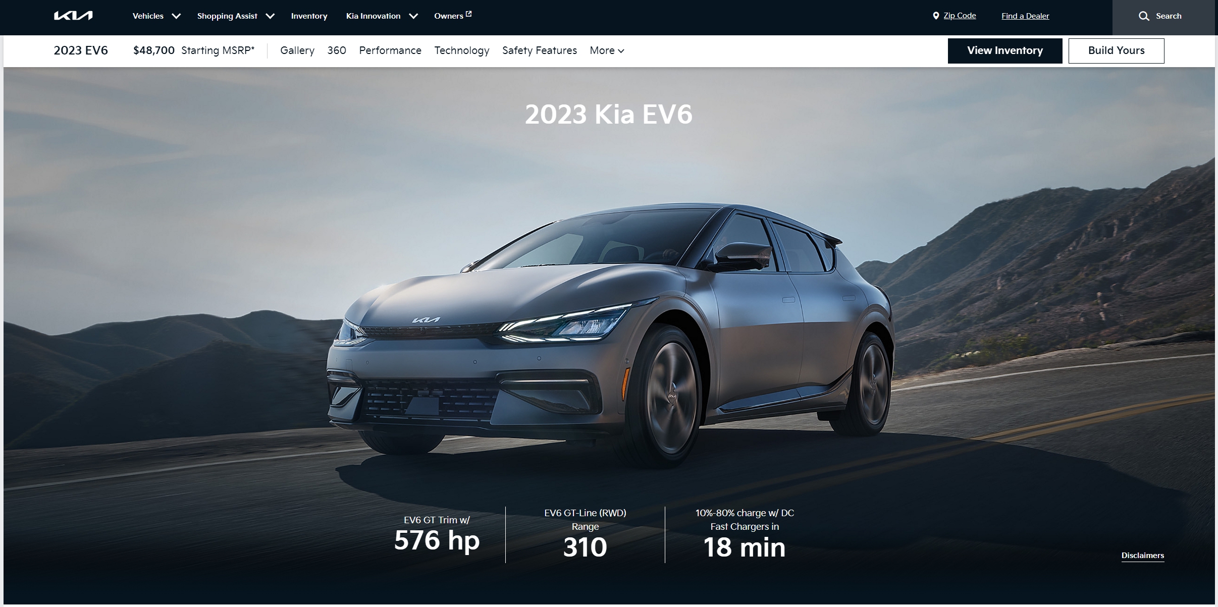 다음은 기아의 EV6입니다. 시작가격 자체가 $48,700으로 아이오닉 5보다 상당히 비싼 편입니다. 사실 왜 비싼지는 바로 아래 기본 사양부터가 다릅니다. 아이오닉 5는 후륜 싱글모터 사양이 160마력의 저사양 모델이지만, EV6는 후륜 싱글모터 사양부터 225마력으로 시작합니다.