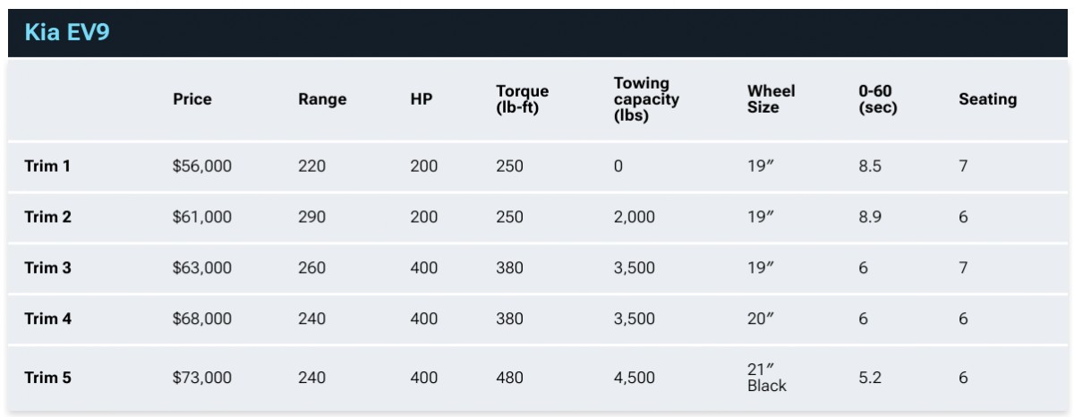 현재 공개된 EV9 전기차의 예상 가격이 $56,000 ~ $73,000인 걸 감안한다면, 기본형은 제네시스 GV60보다 저렴하나, 풀옵션 사양은 또 비싼 편입니다. 같은 회사의 EV6와 비교를 하게 될 경우, EV6 GT-라인 듀얼 모터의 가격과 EV9의 기본형 모델 가격이 비슷한 수준입니다.