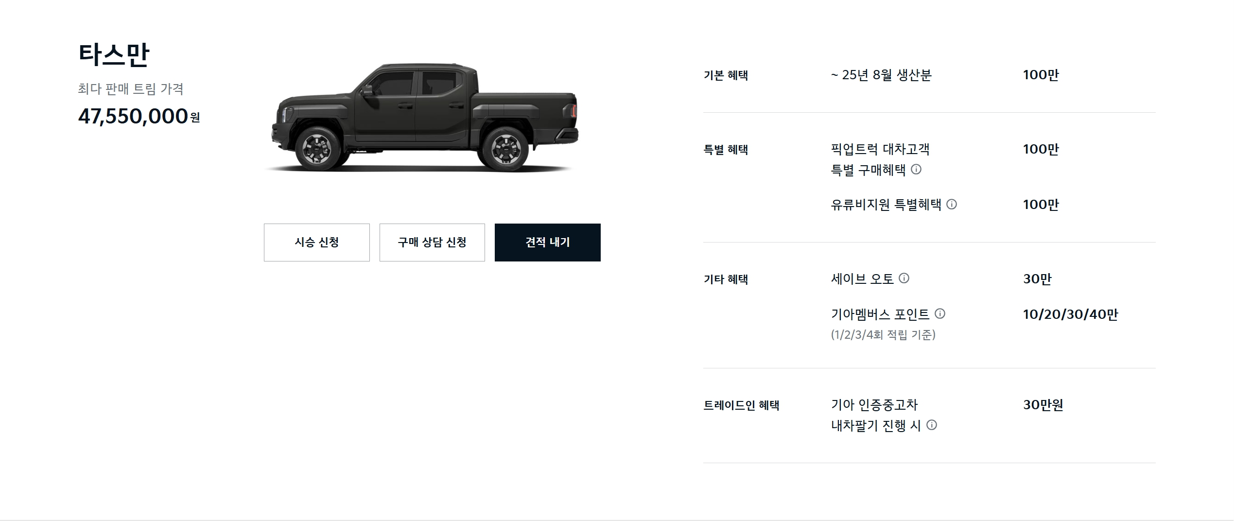 할인을 좀처럼 안 할 거 같은 타스만이, 출시한 지 얼마 안 되었음에도 재고 할인 100만원이 생겼습니다.