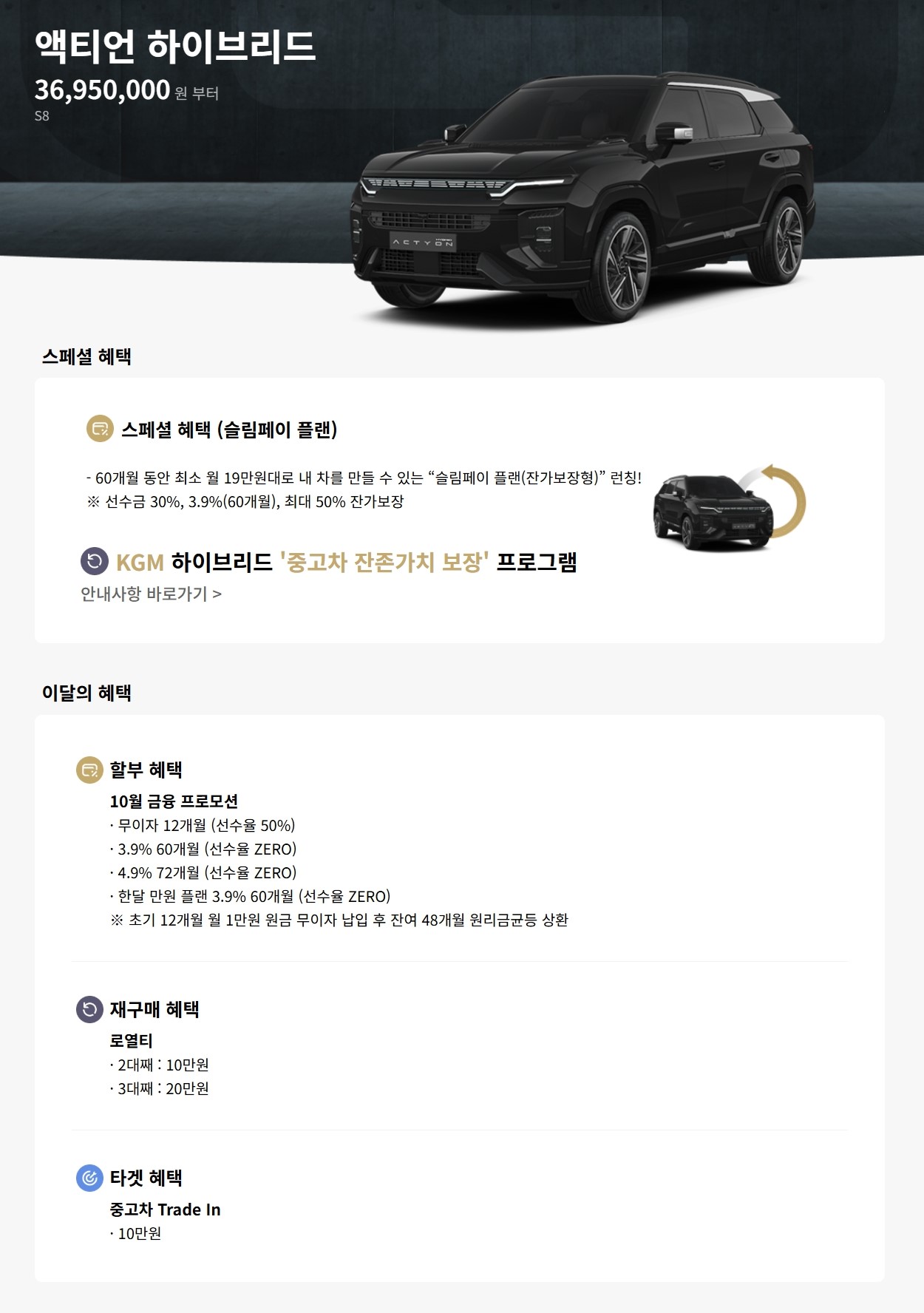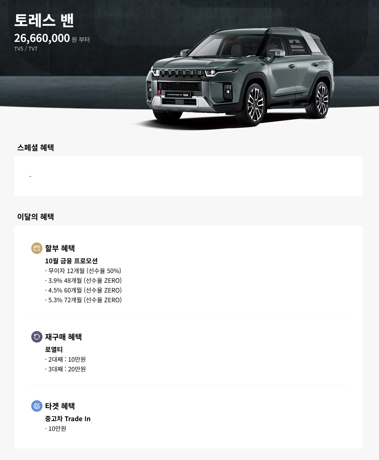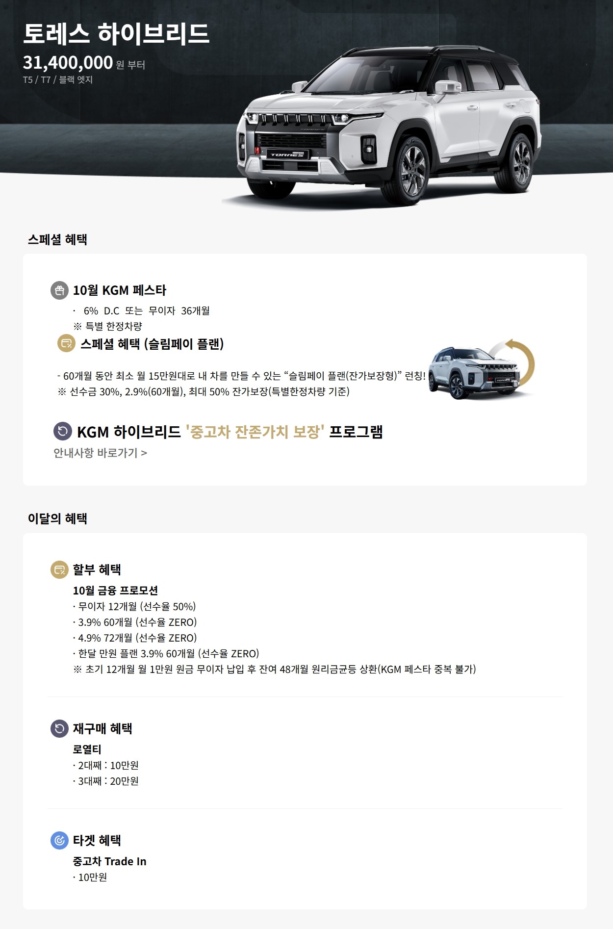 일반적으로 하이브리드 모델은 인기가 많아, 할인이 적은 편인데, 토레스 하이브리드도 프로모션이 있네요!