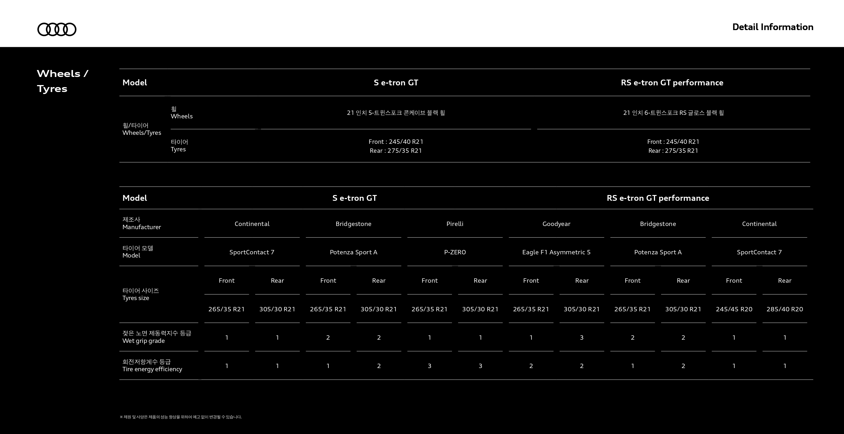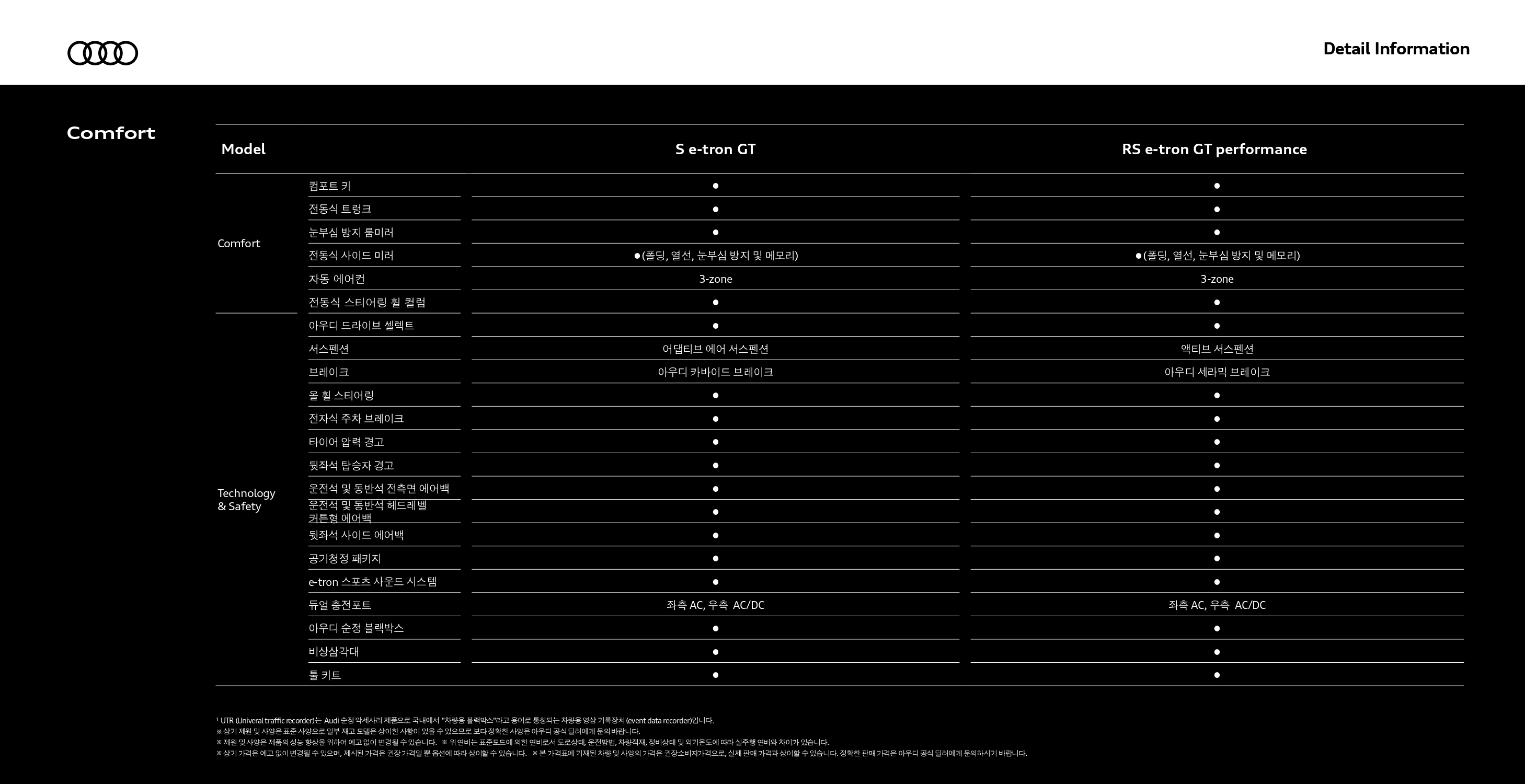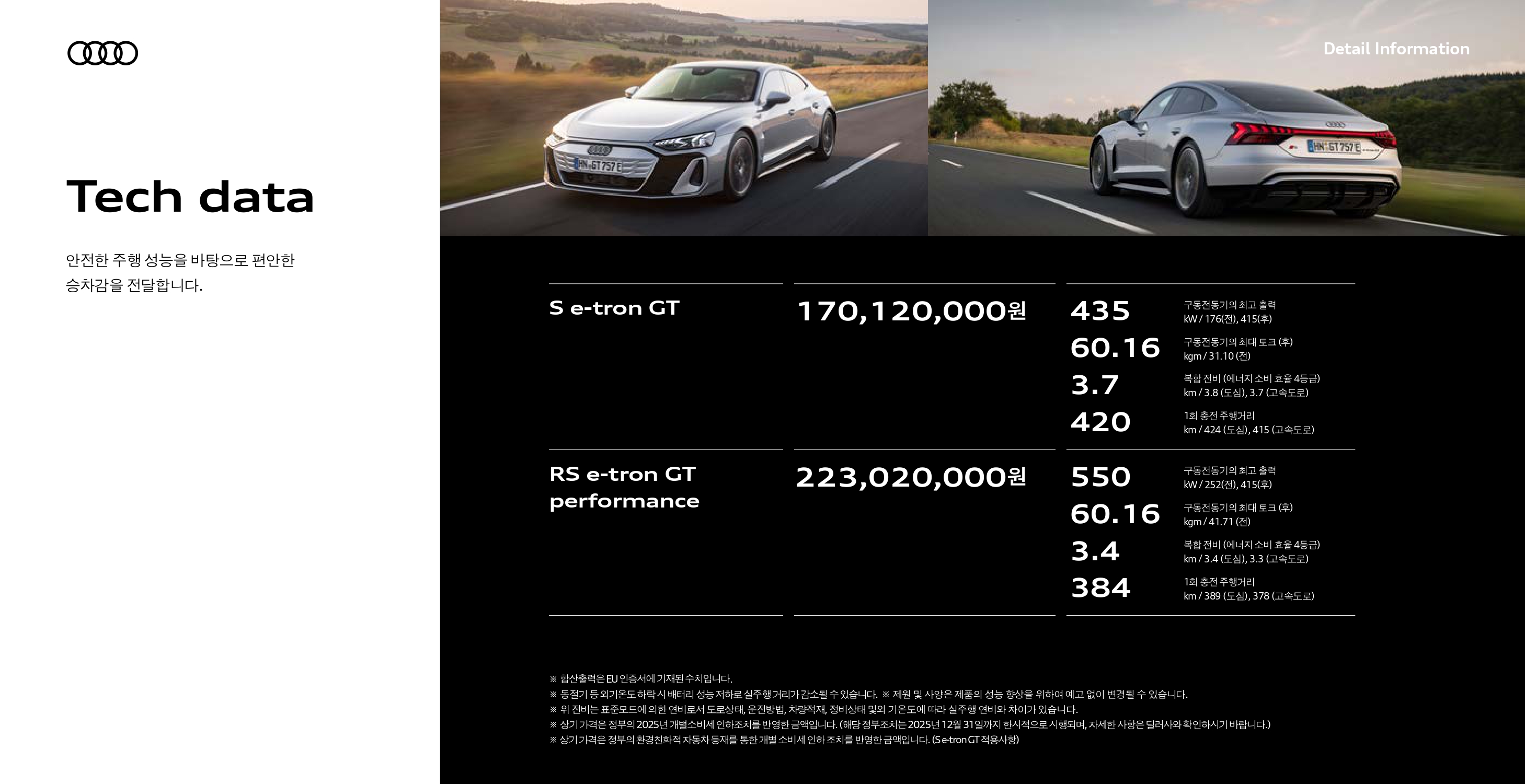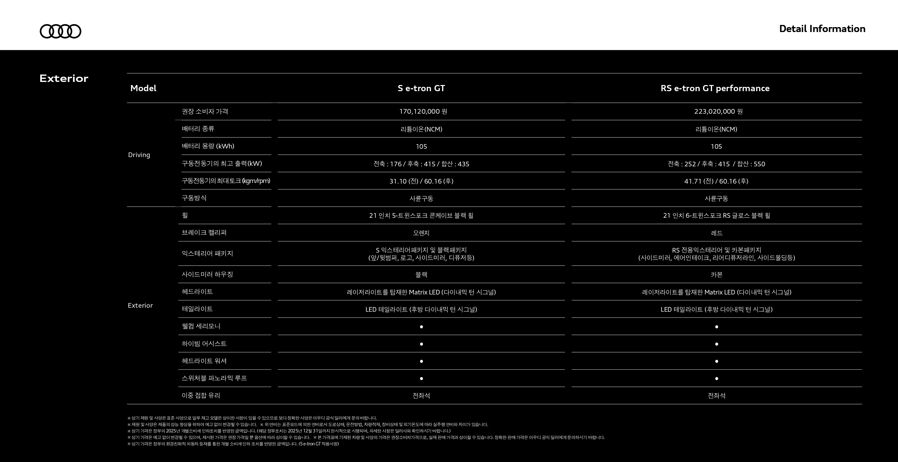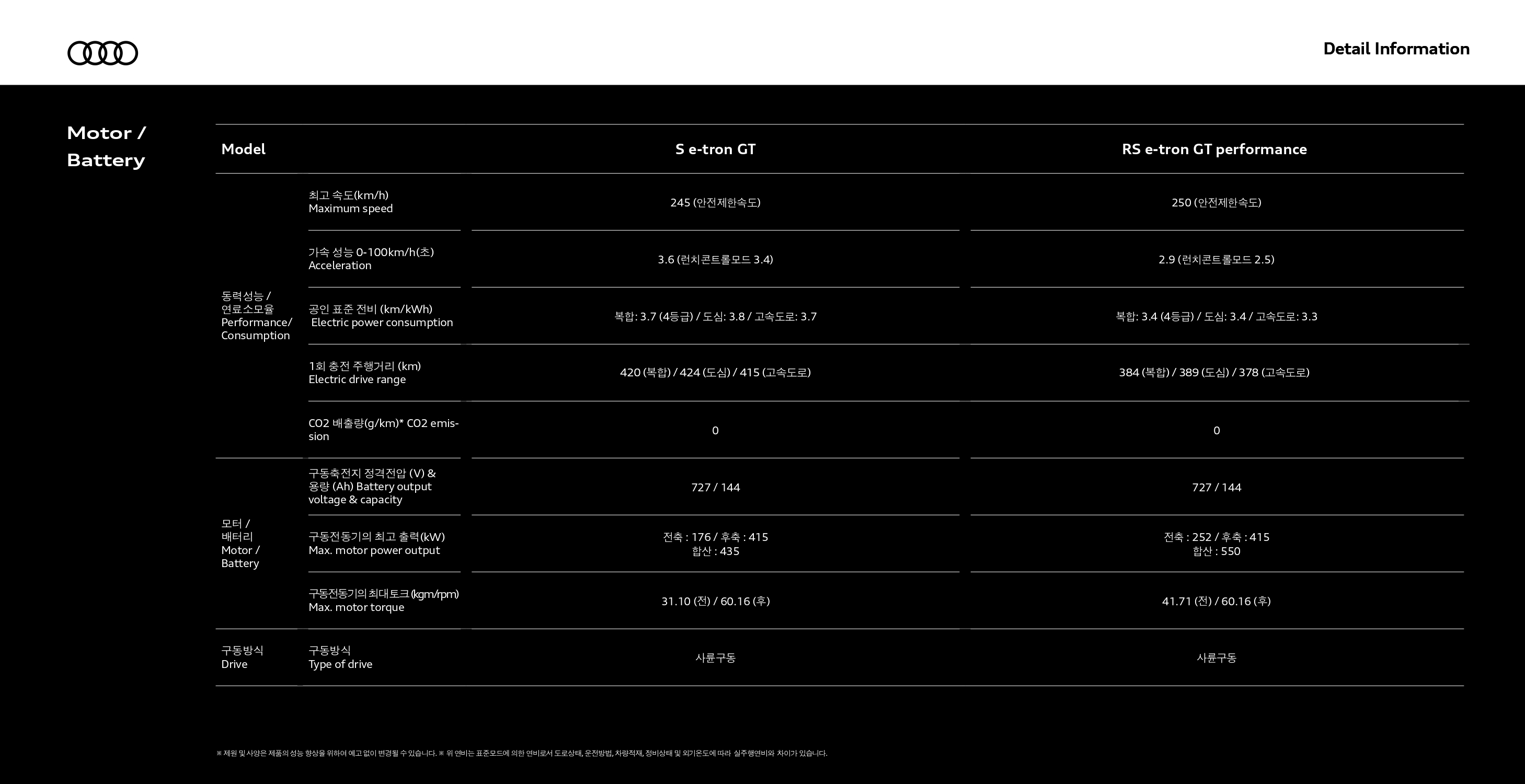 국내에는 중간 사양이라 할 수 있는 RS e-트론 GT 기본형은 수입이 안되어, 두 모델 간 성능 차이가 더 벌어져, 차이가 큰 편이라 할 수 있습니다.