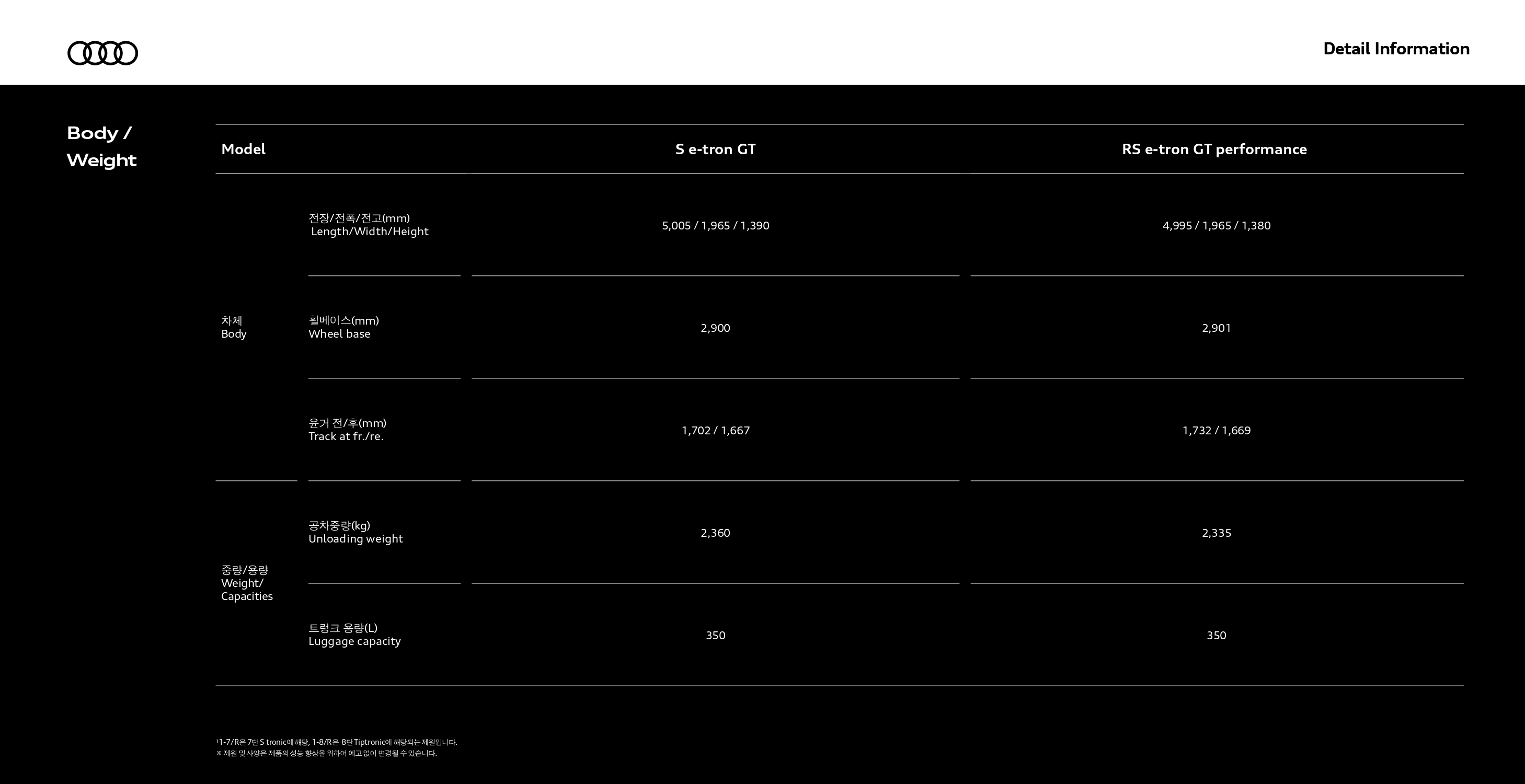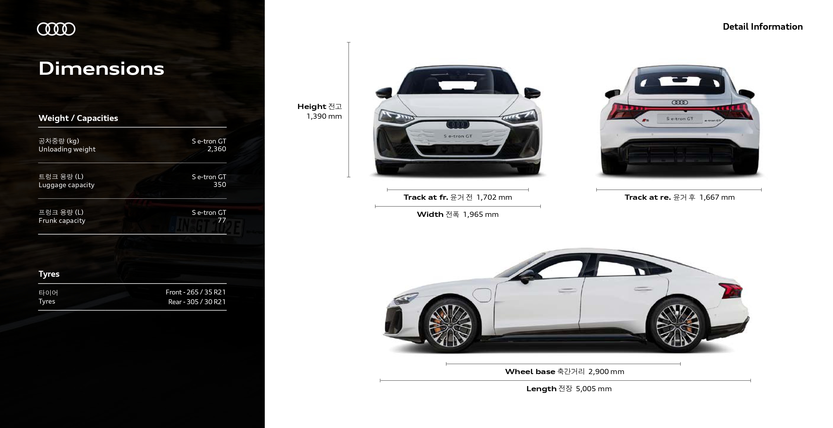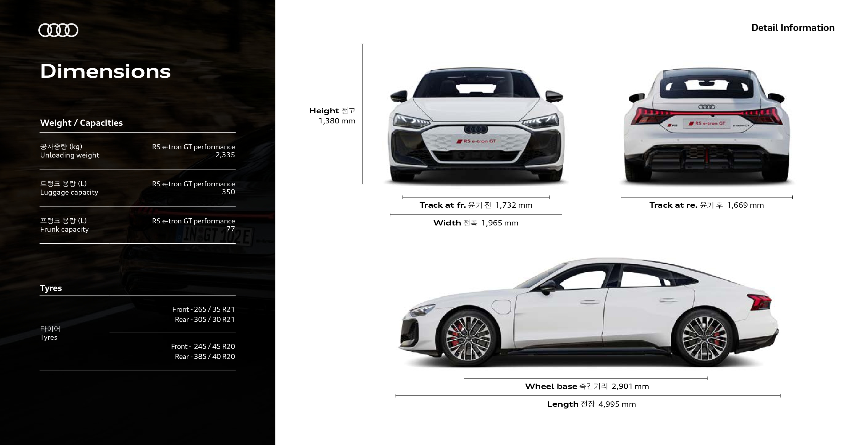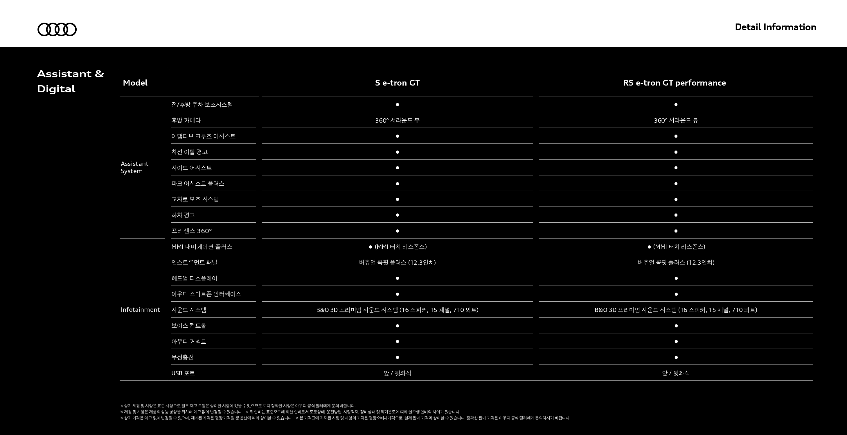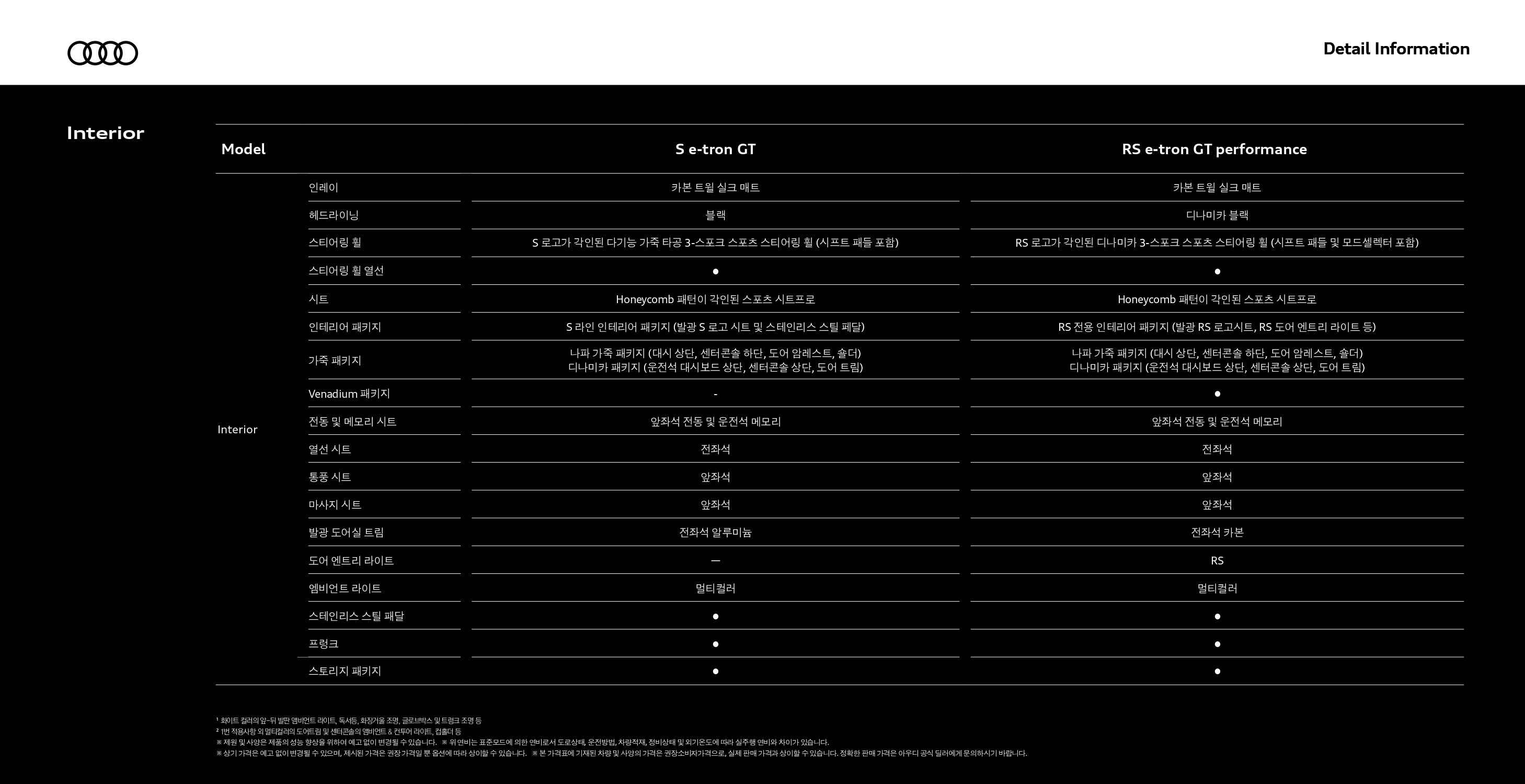 국내에는 중간 사양이라 할 수 있는 RS e-트론 GT 기본형은 수입이 안되어, 두 모델 간 성능 차이가 더 벌어져, 차이가 큰 편이라 할 수 있습니다.