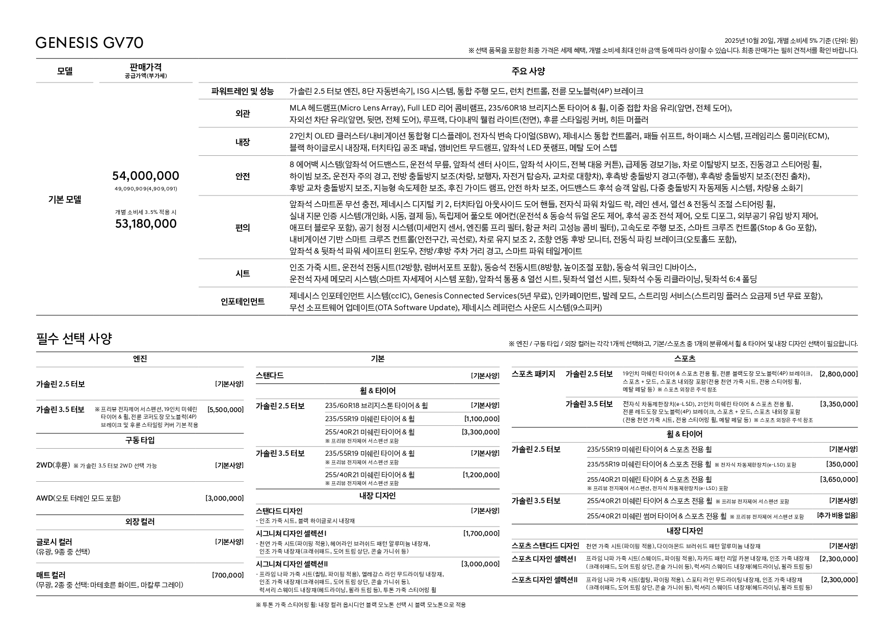 마지막으로 26년형 GV70 스펙인데, 25년형 모델과 동일합니다.
