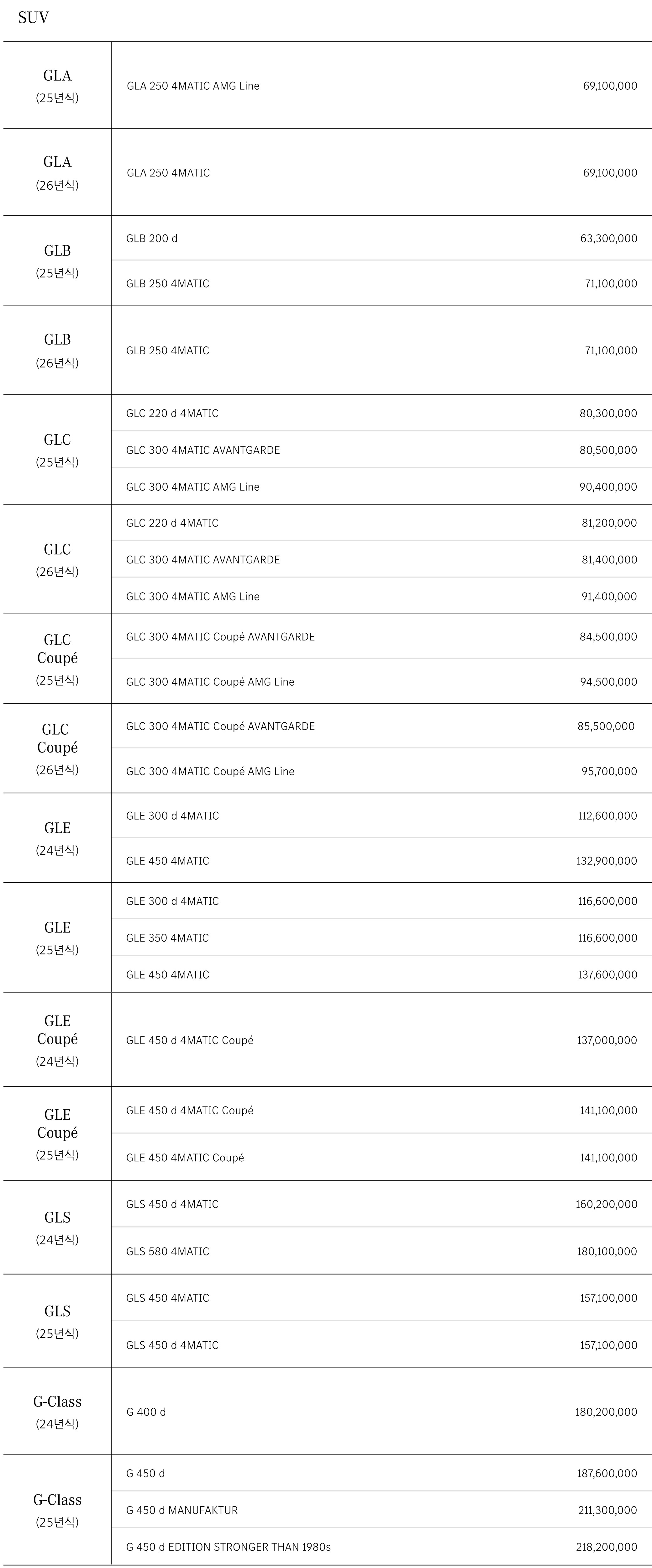 GLA / GLB / GLC / GLC쿠페 / GLE / GLE쿠페 / GLS / G바겐 가격표