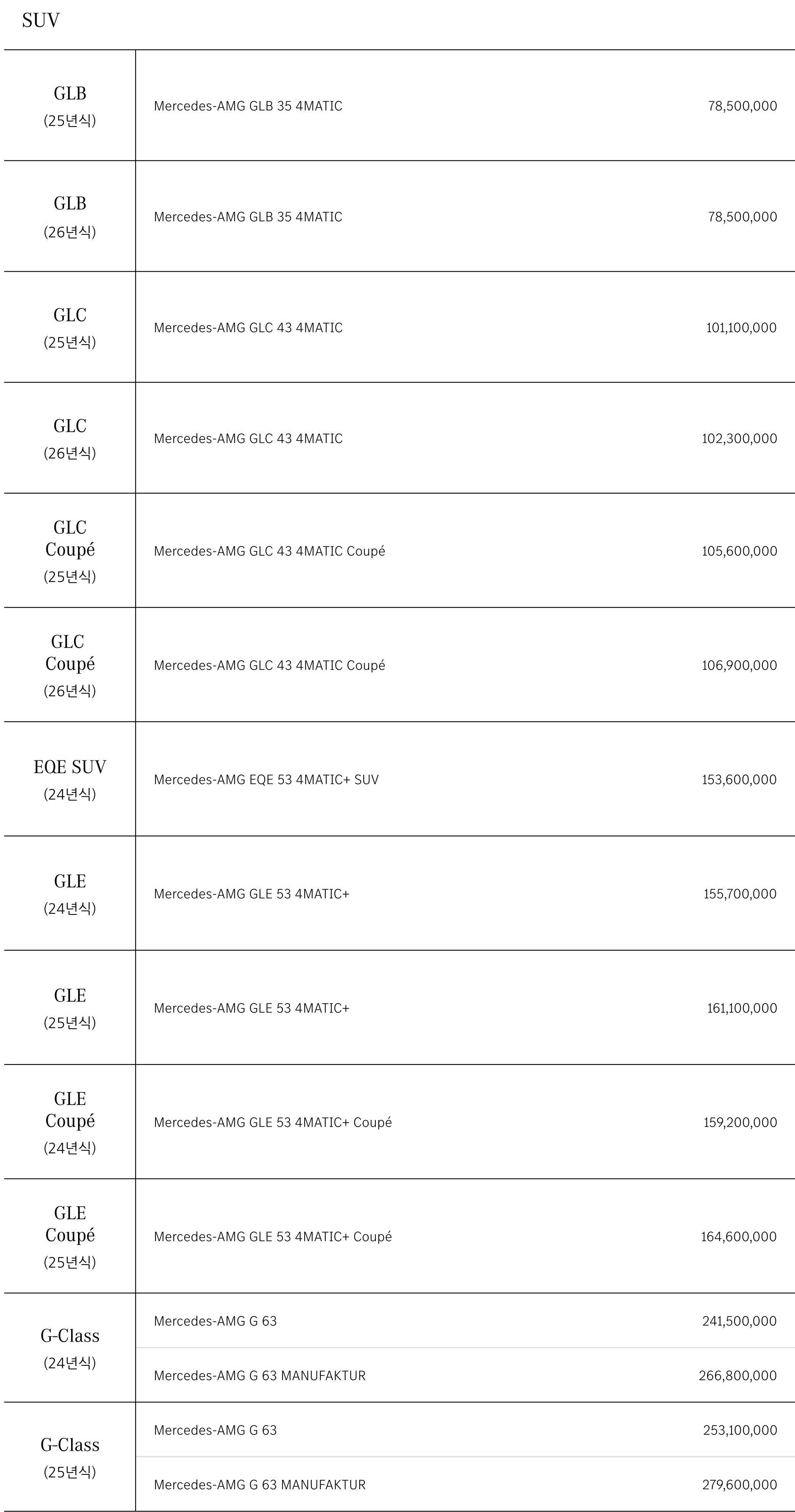 GLB35 AMG / CLC43 AMG / EQE53 SUV AMG / GLE53 AMG / G63 AMG 가격표