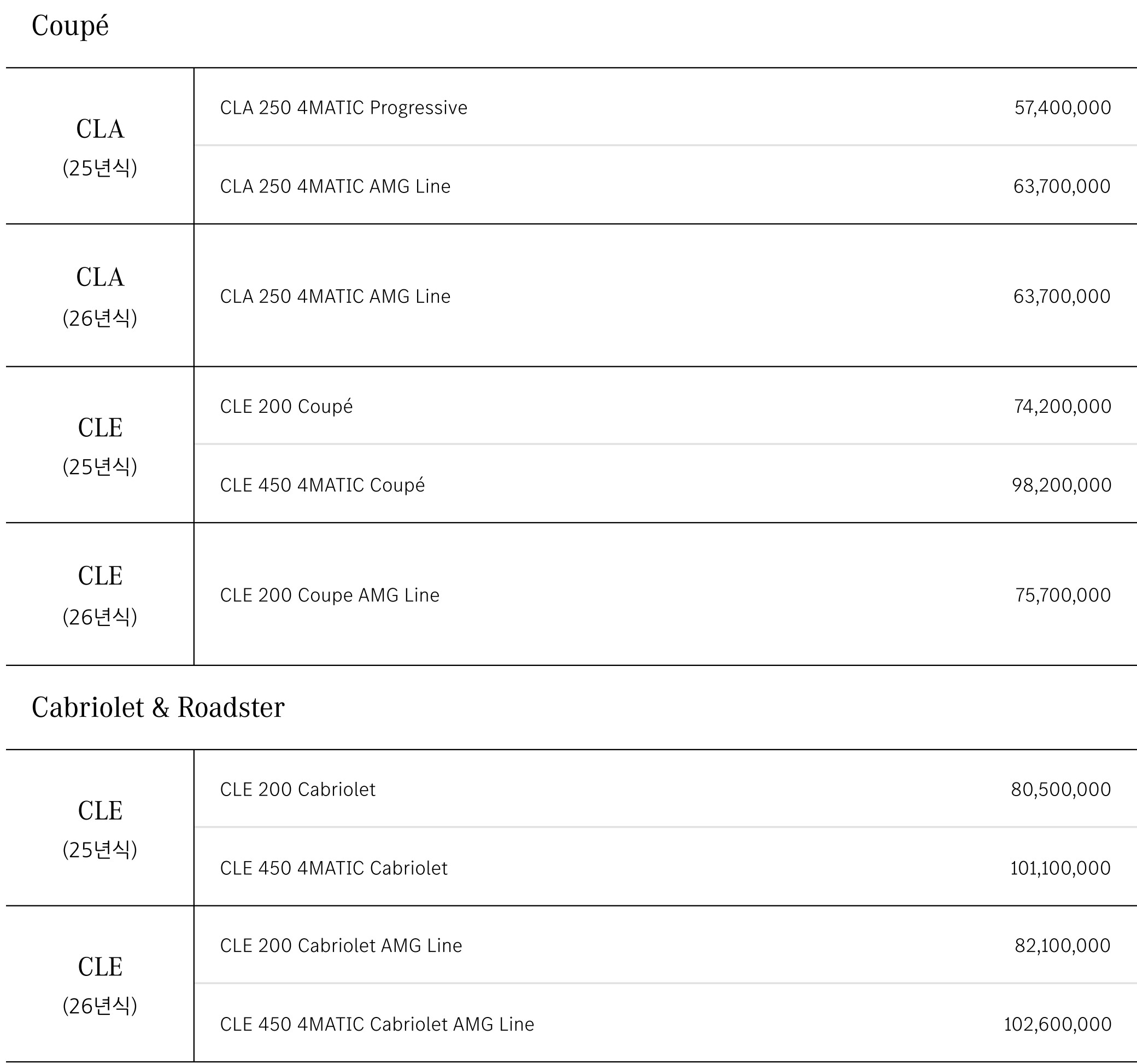 26년식 CLE AMG 쿠페 및 카브리올레 라인업이 각각 추가되었습니다.