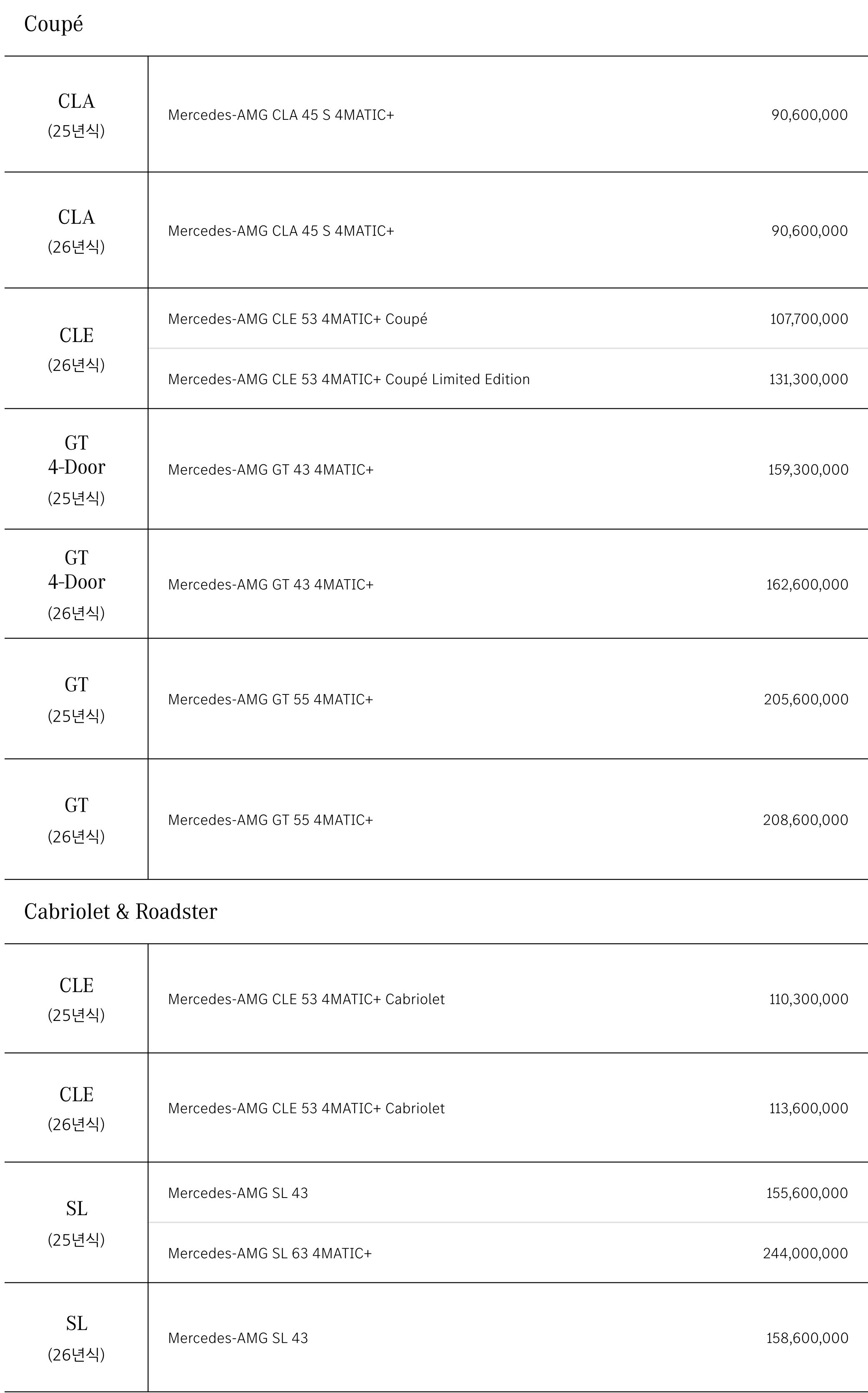 CLA45 AMG / CLE53 AMG 쿠페 / AMG GT 43 / AMG GT 55 / CLE53 AMG 카브리올레 / SL43 AMG / SL63 AMG 가격표