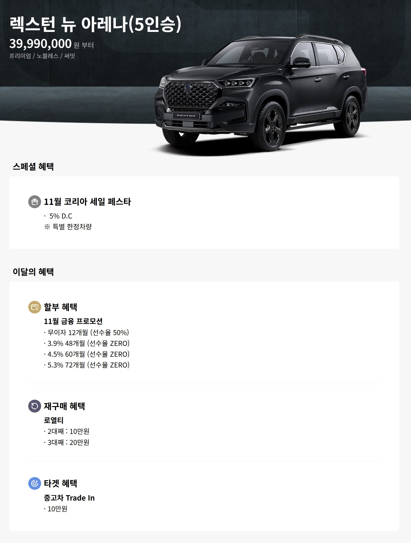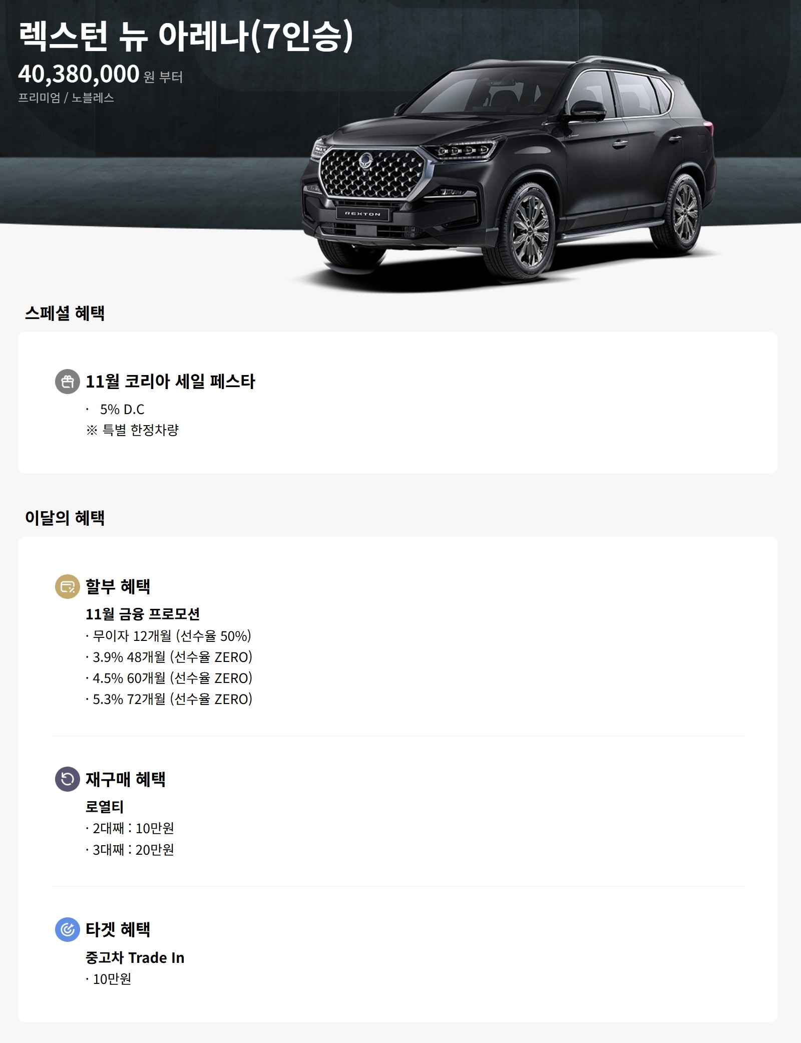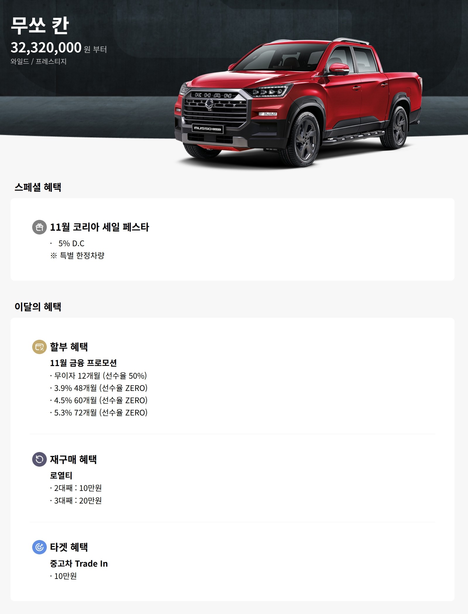단, 렉스턴이나 무쏘스포츠/칸은 평소에도 유사한 수준의 재고할인이 있으니, 혹하실 필요까지는 없고요.