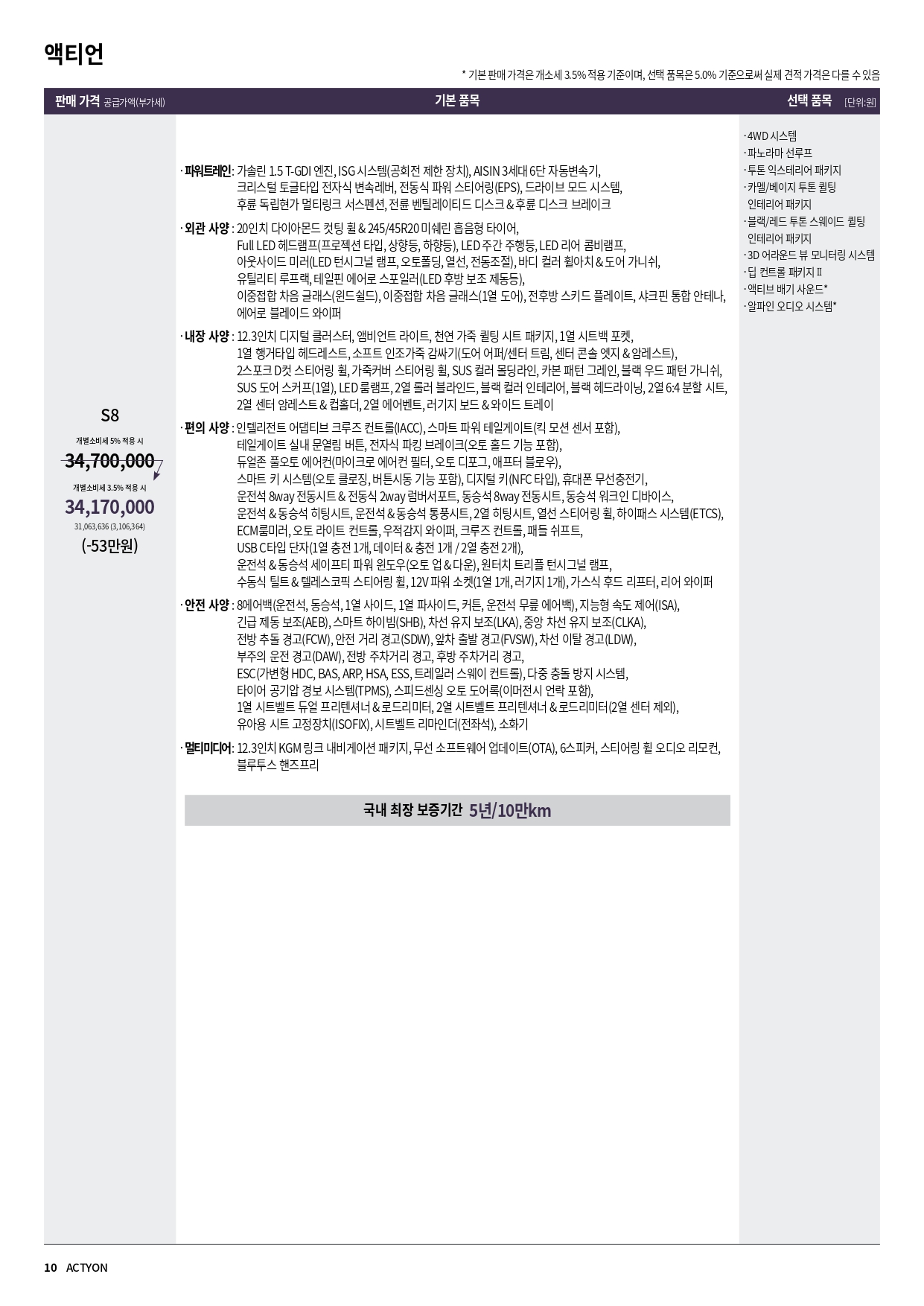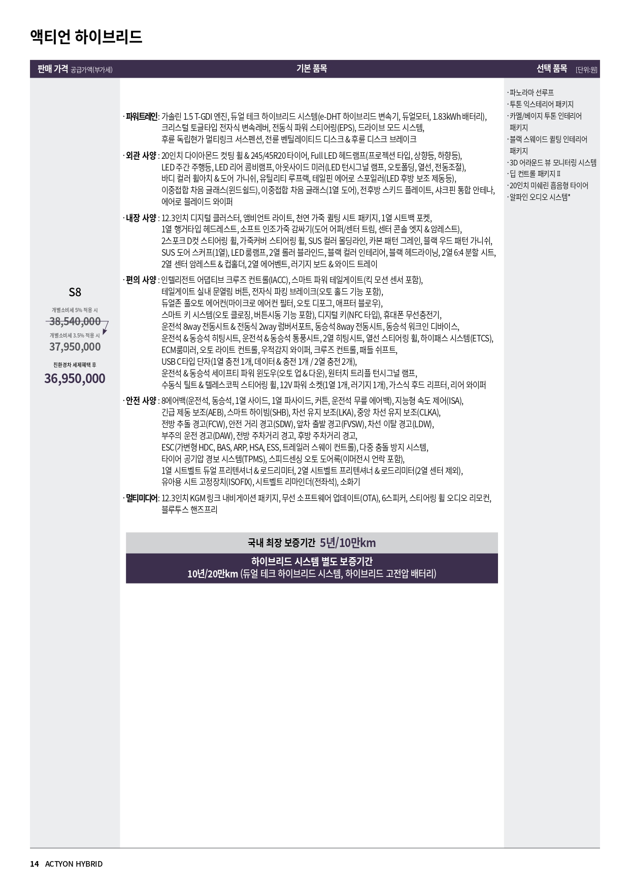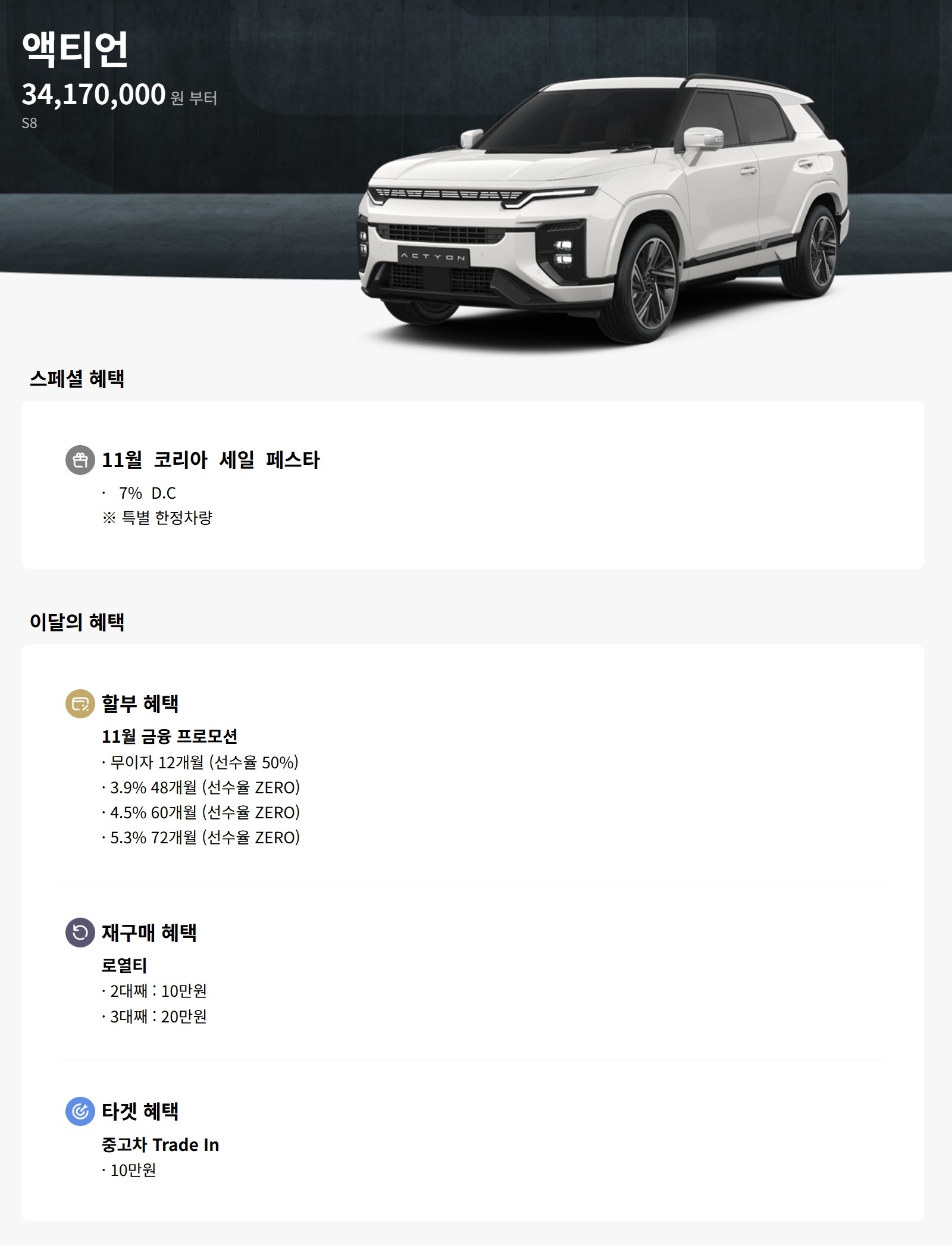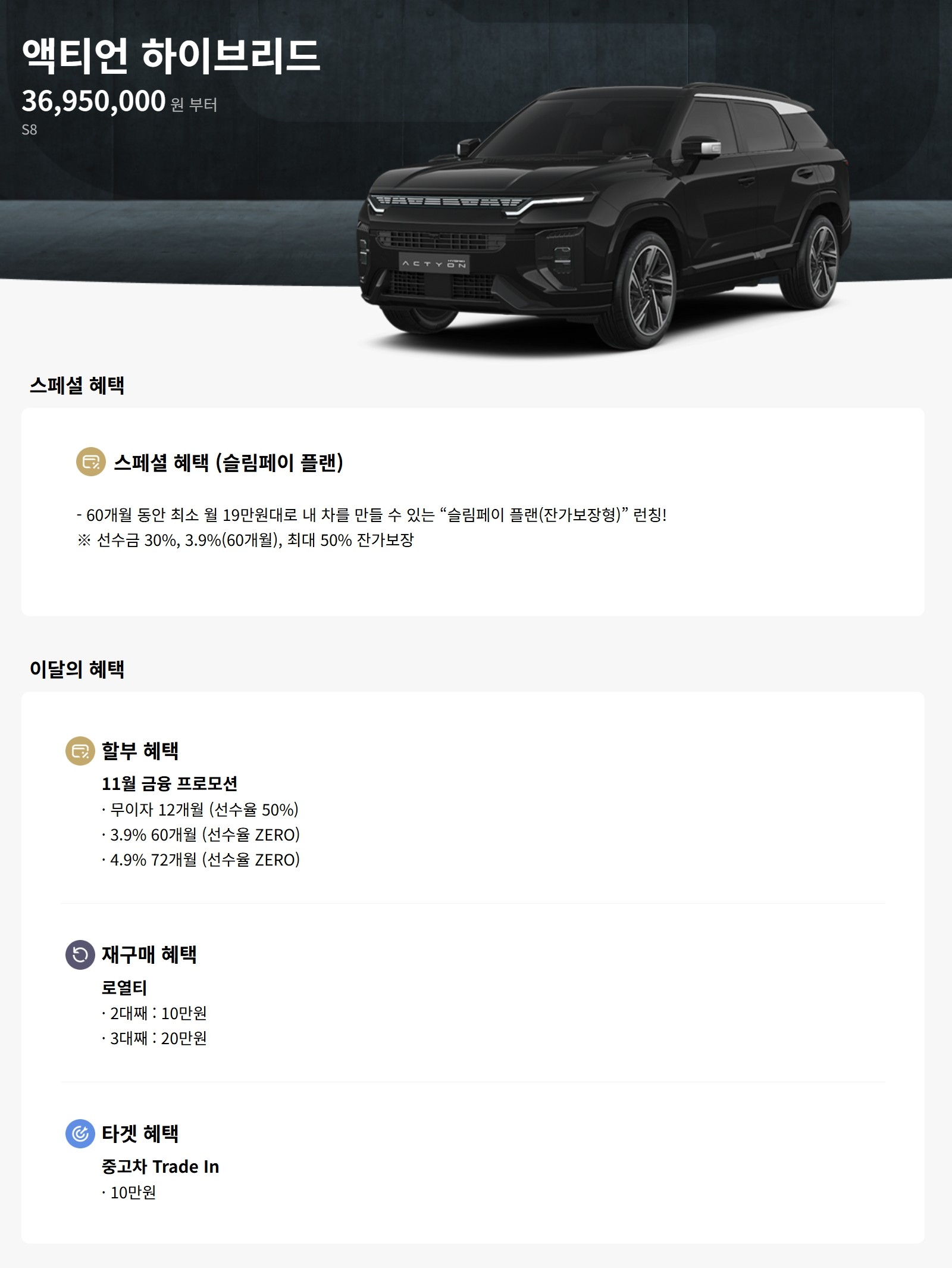 토레스 하이브리드가 큰 폭의 할인을 하는 것에 비하여, 액티언 하이브리드는 별도 할인이 없습니다.