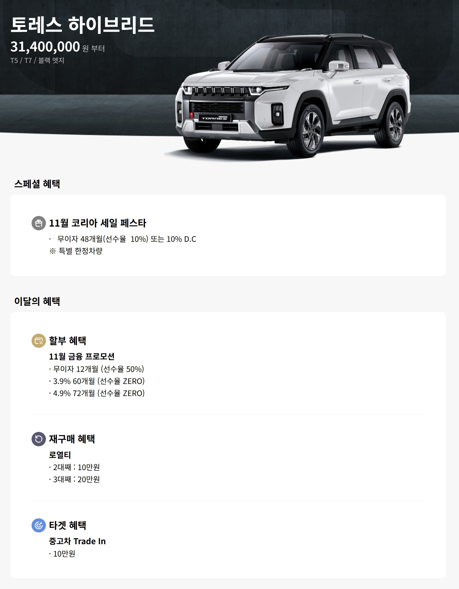 다만, 토레스 하이브리드와 같이 무이자 48개월이나 10% 할인이 있는 경우라면, 구매를 고려해 봄직하지 않을까 싶네요.