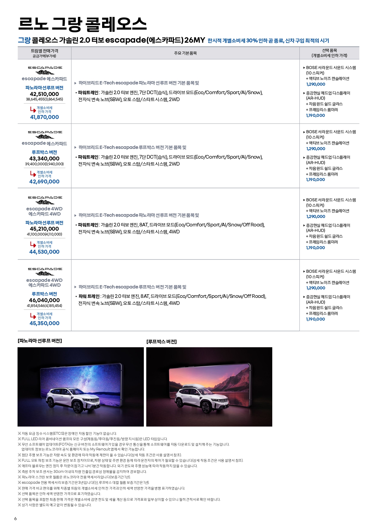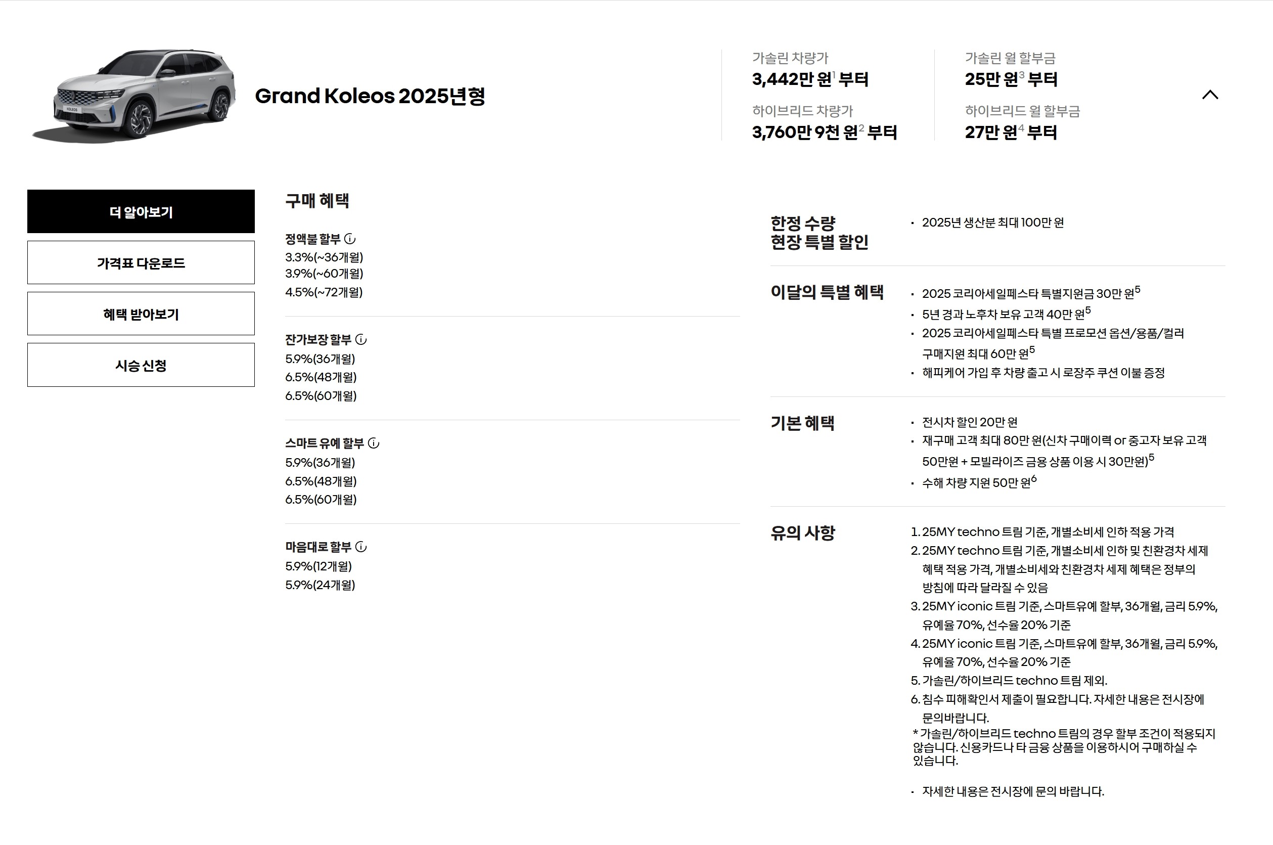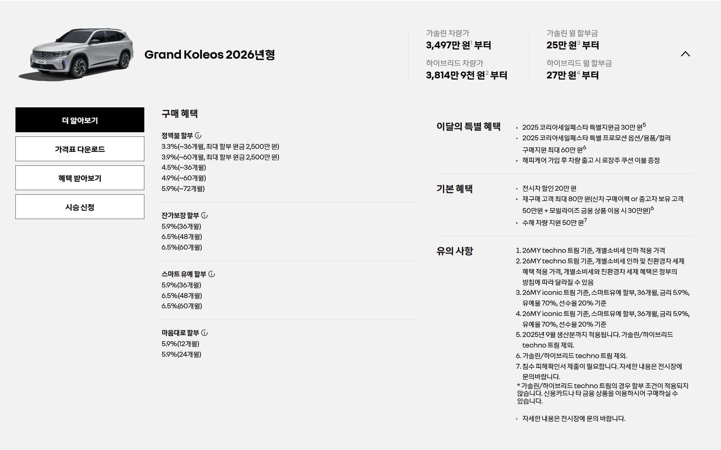 그랑콜레오스는 25년형 재고도 아직 남아 있어, 25/26년형 프로모션과 가격표가 따로 적용됩니다.