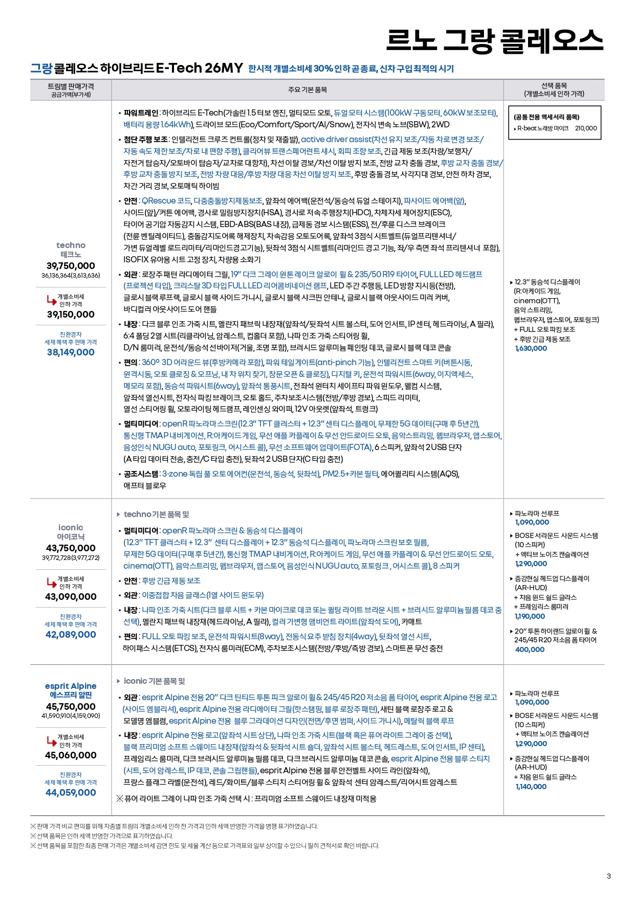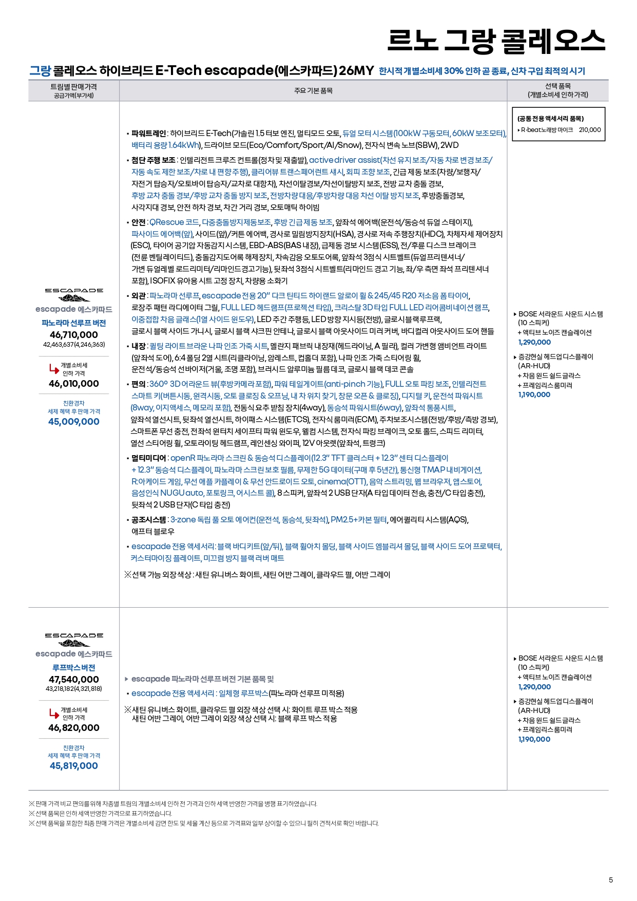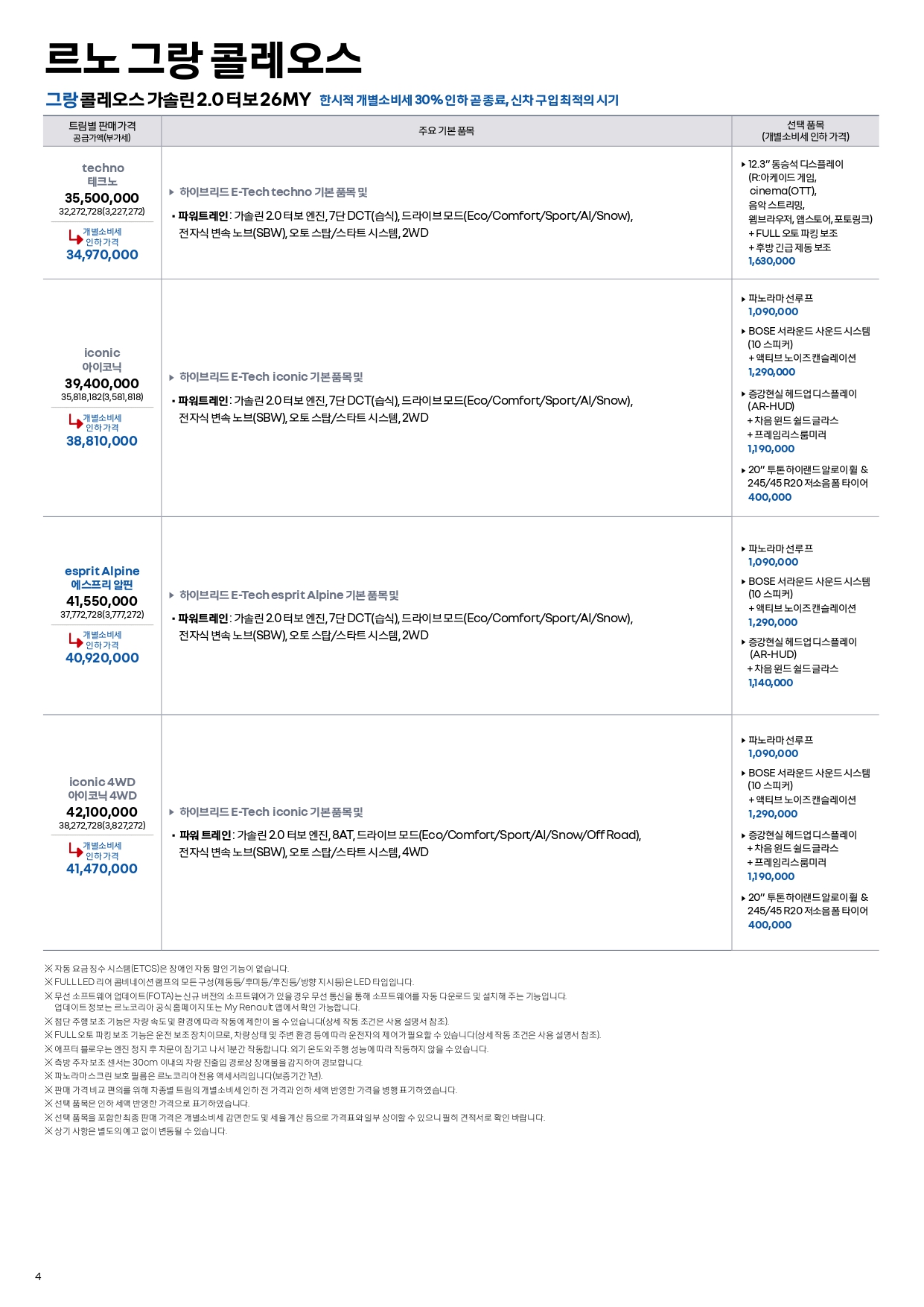 그랑콜레오스는 25년형 재고도 아직 남아 있어, 25/26년형 프로모션과 가격표가 따로 적용됩니다.