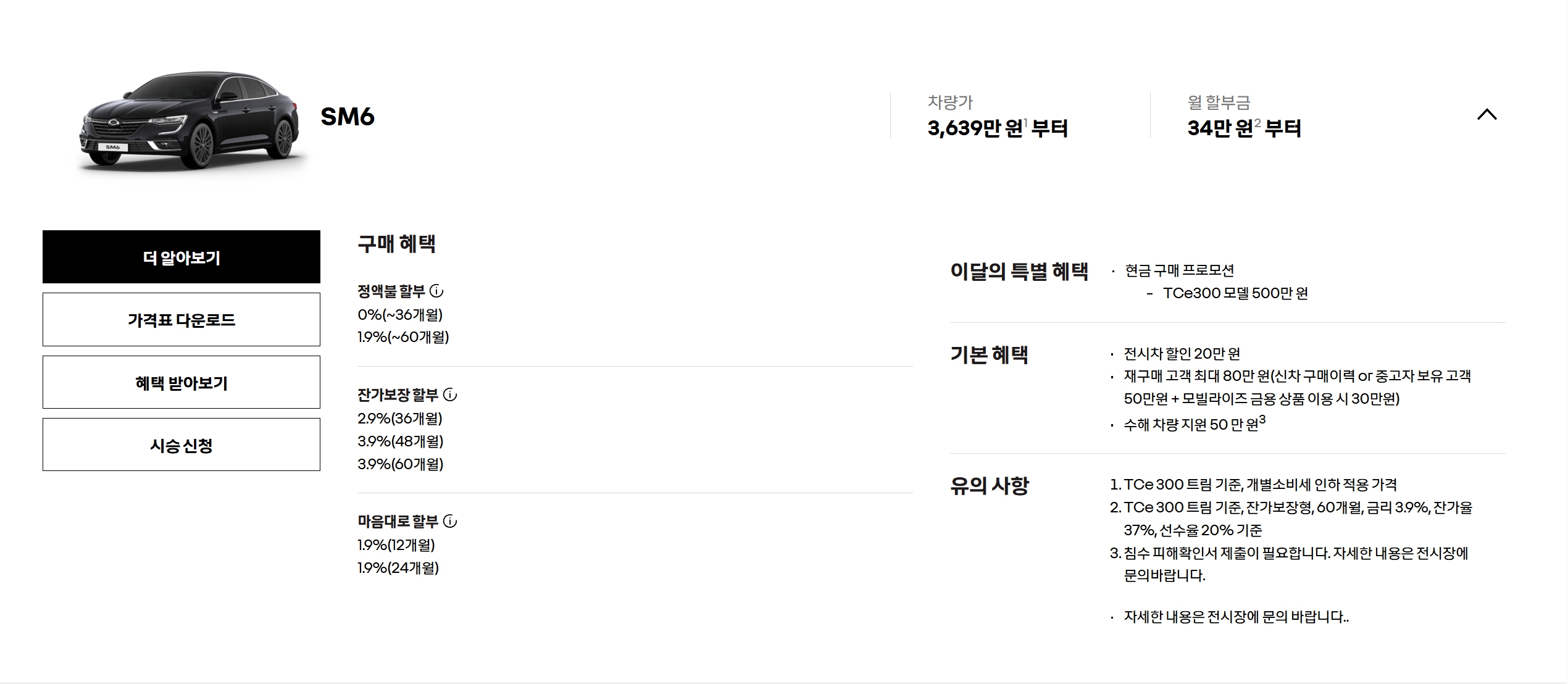 SM6는 잔여 재고에 대한 할인만 하는 중이라, TCe300 모델만 500만원 할인 중입니다.