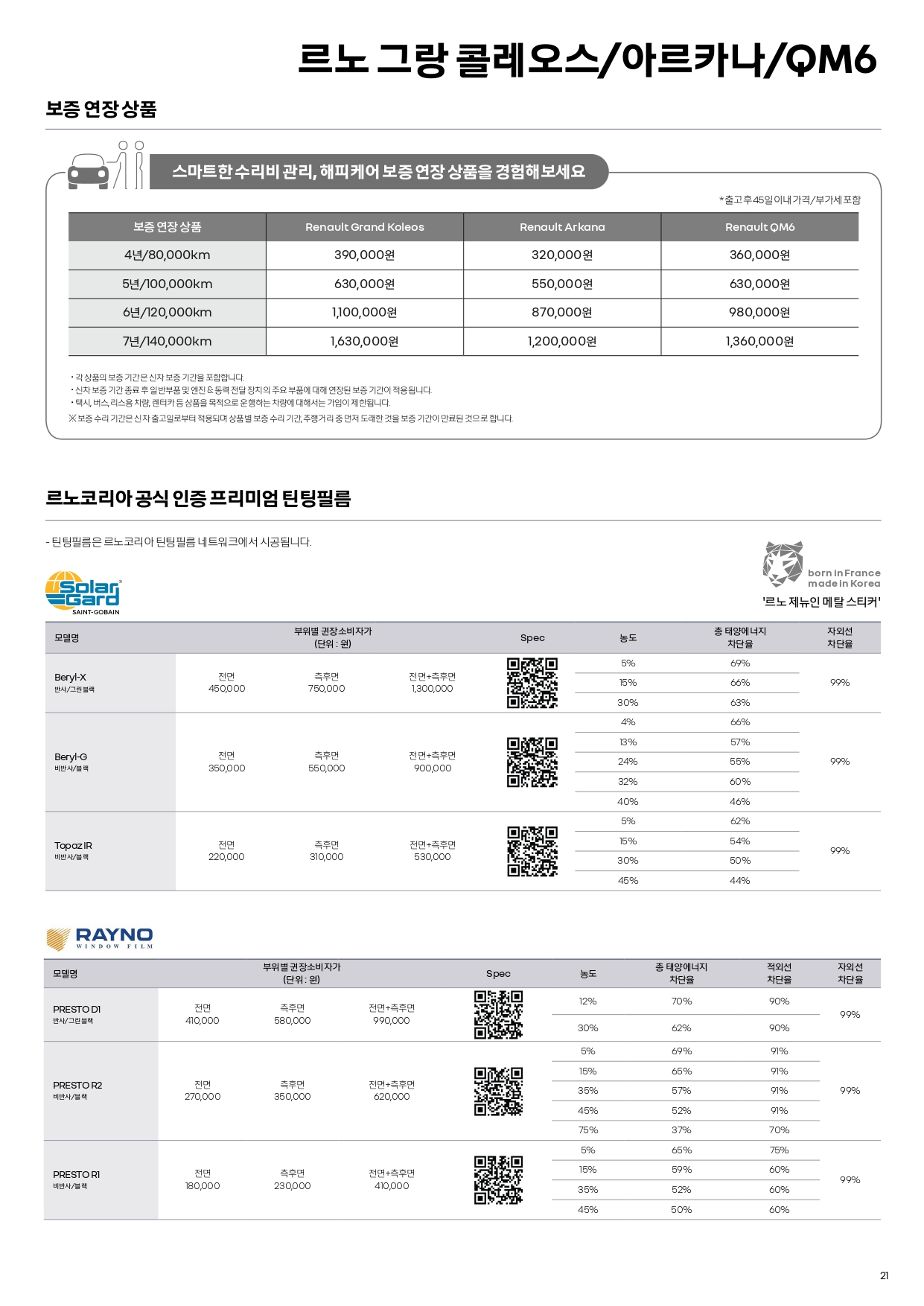 르노 보증 연장 상품인 해피케어 가격표 입니다.