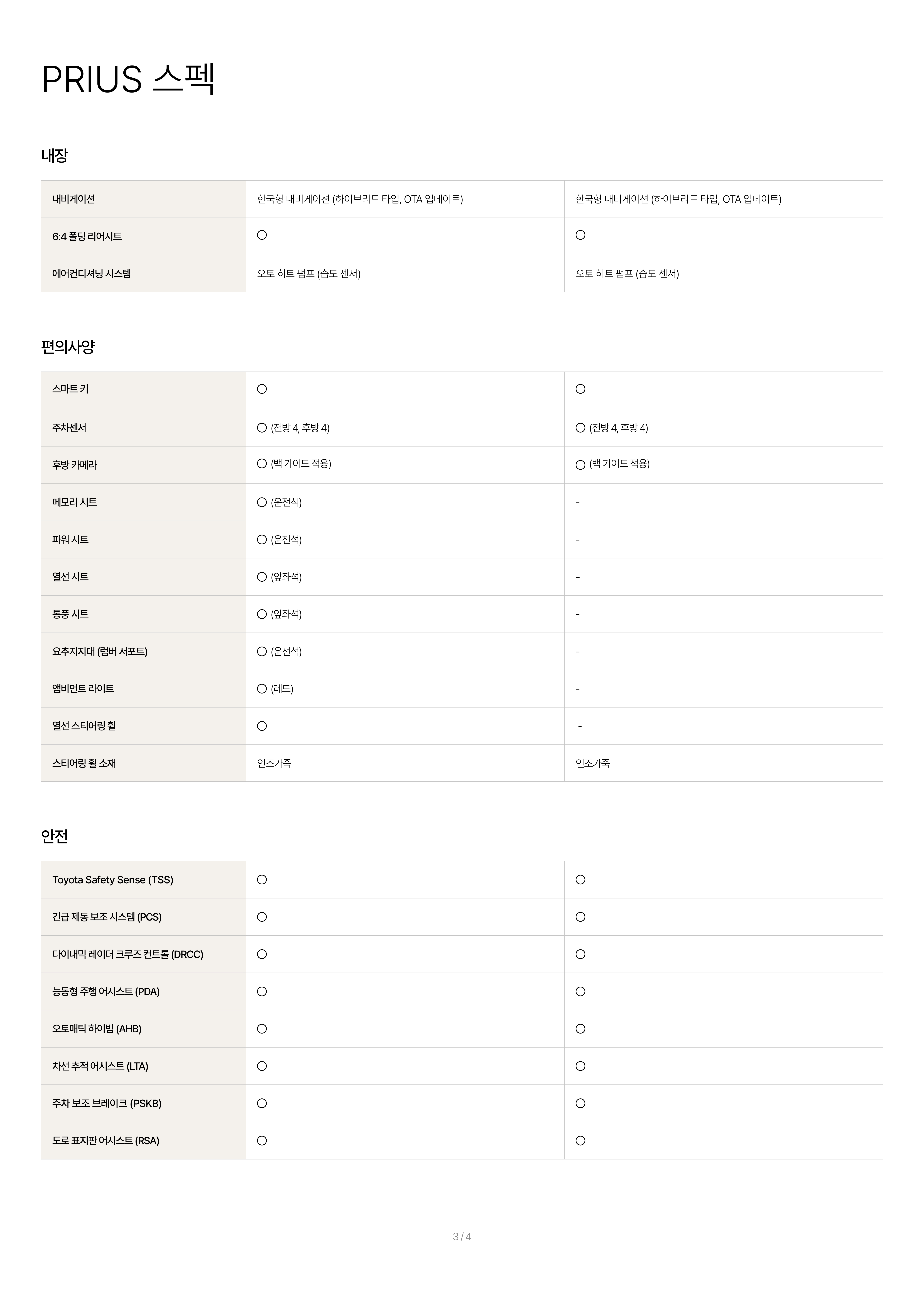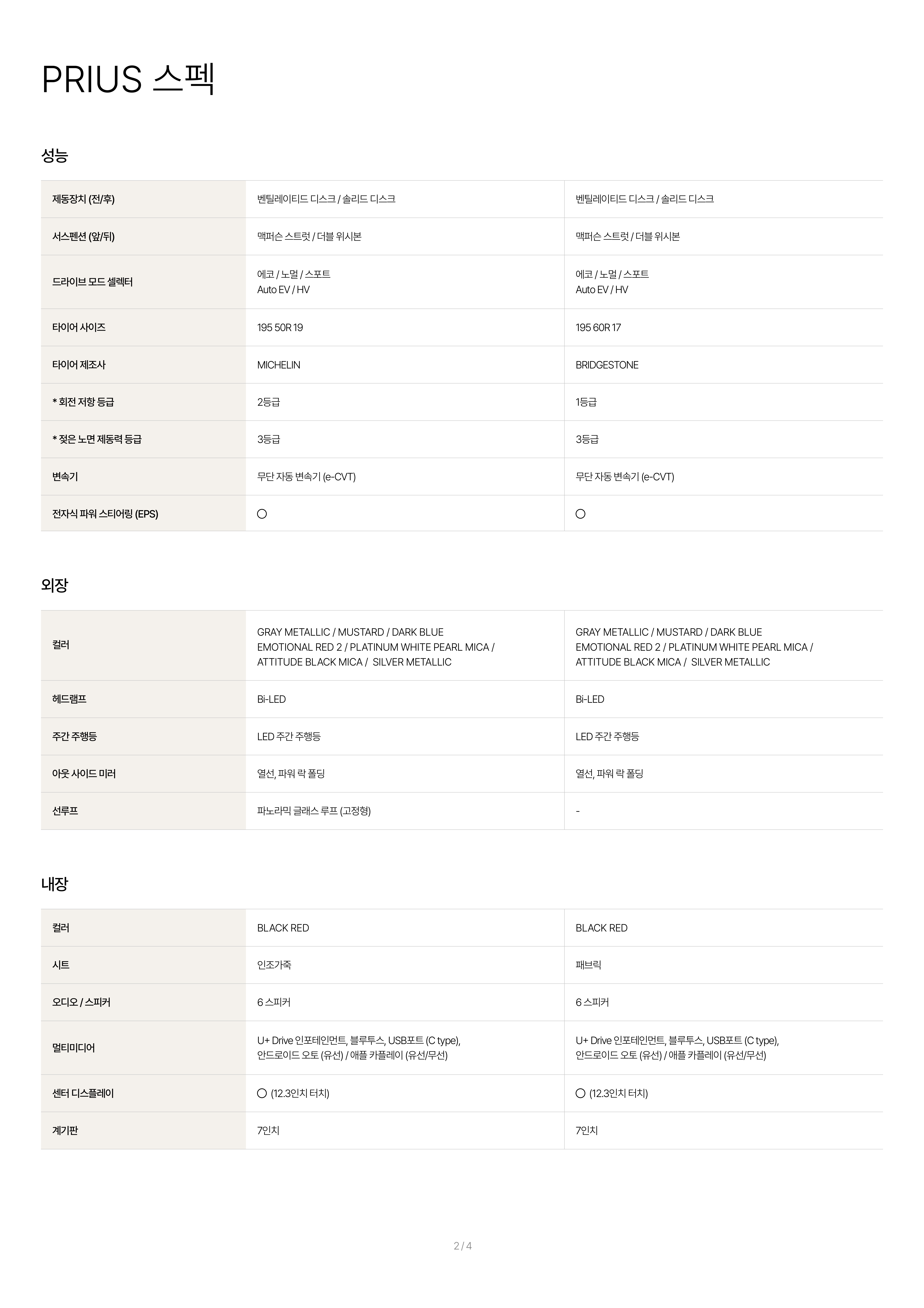 마지막으로, 토요타에서 제공하는 제원, 옵션표를 아래에 공유드리오니, 필요하신 분께서는 받아 가시기 바랍니다.