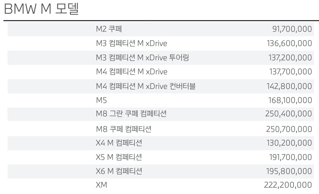 BMW M라인업 가격표