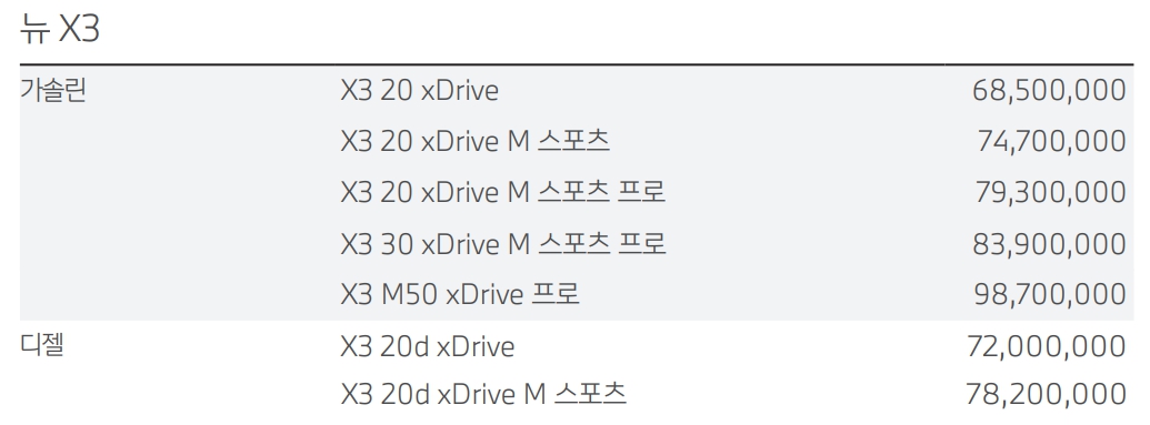 BMW X3 가격표
