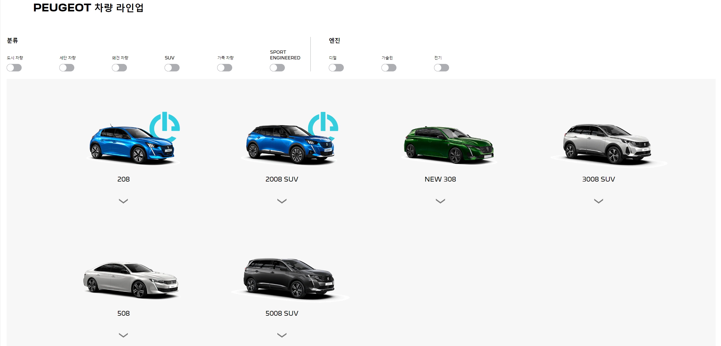 위 사진은 현재 푸조가 국내에 수입하여 판매하고 있는 차량의 전체 라인업입니다. 전기차량을 제외하면, 가솔린 차량은 어떤 차량이 있을까요? 푸조 3008, 단 하나의 차종만이 현재 가솔린을 수입하고 있습니다.