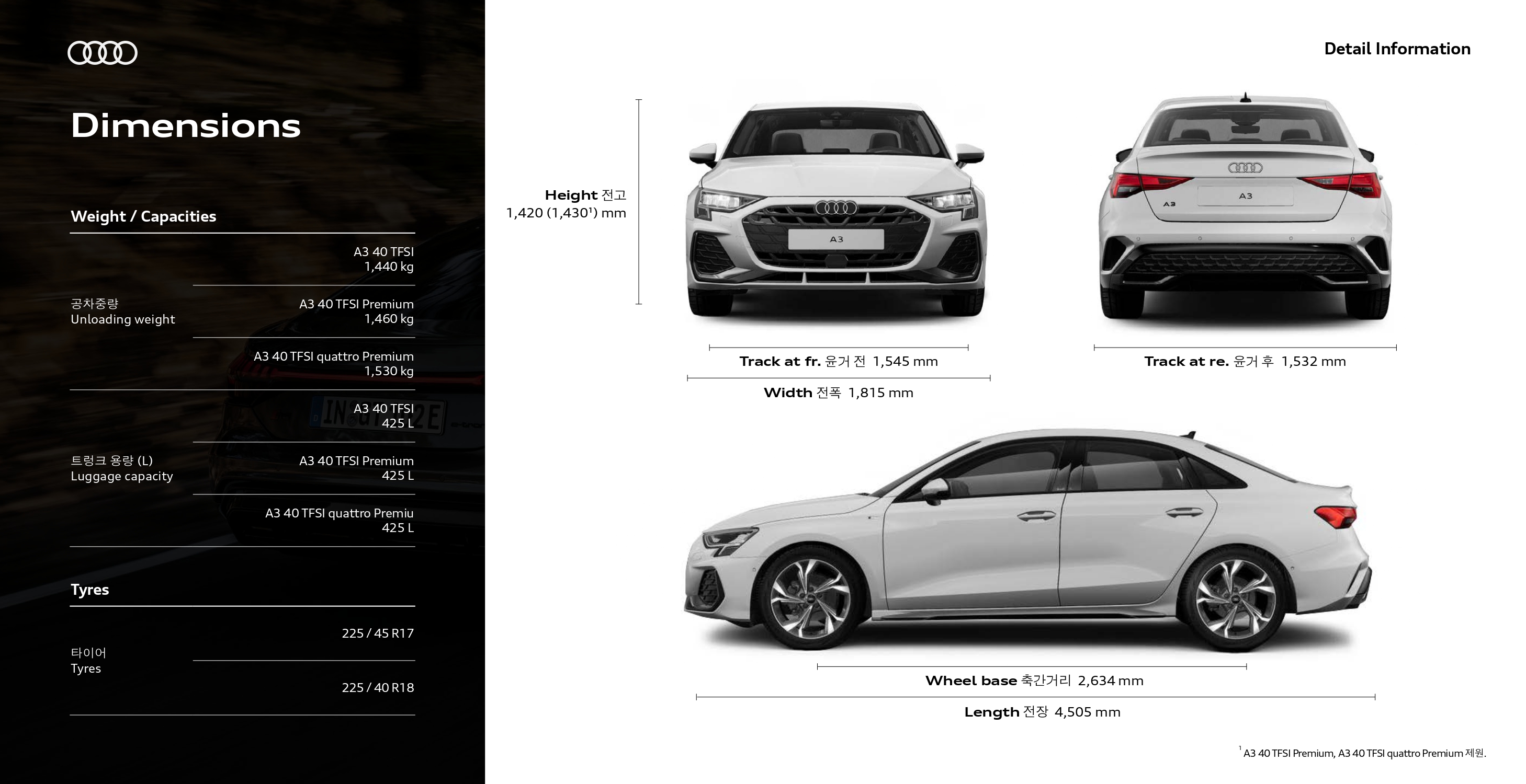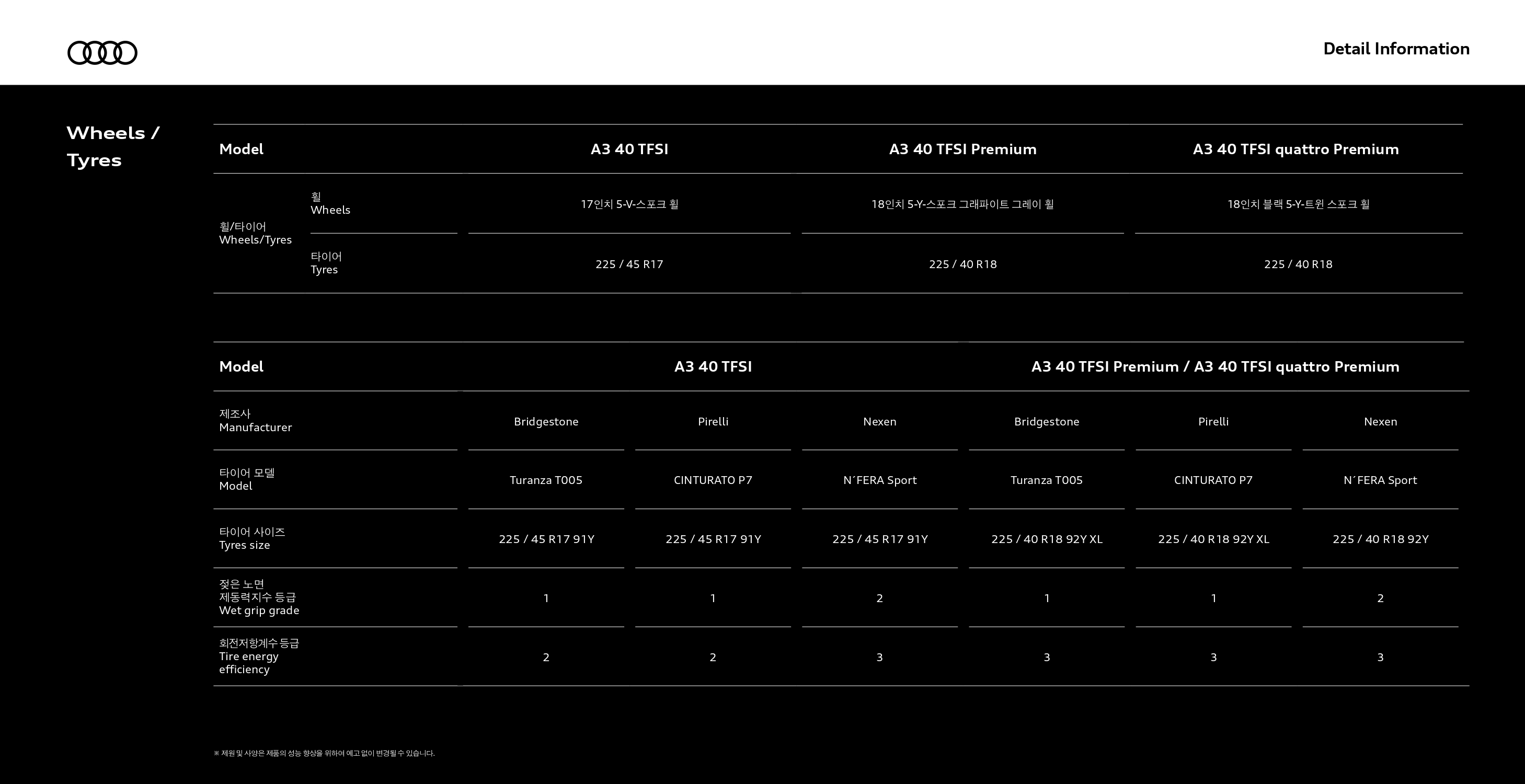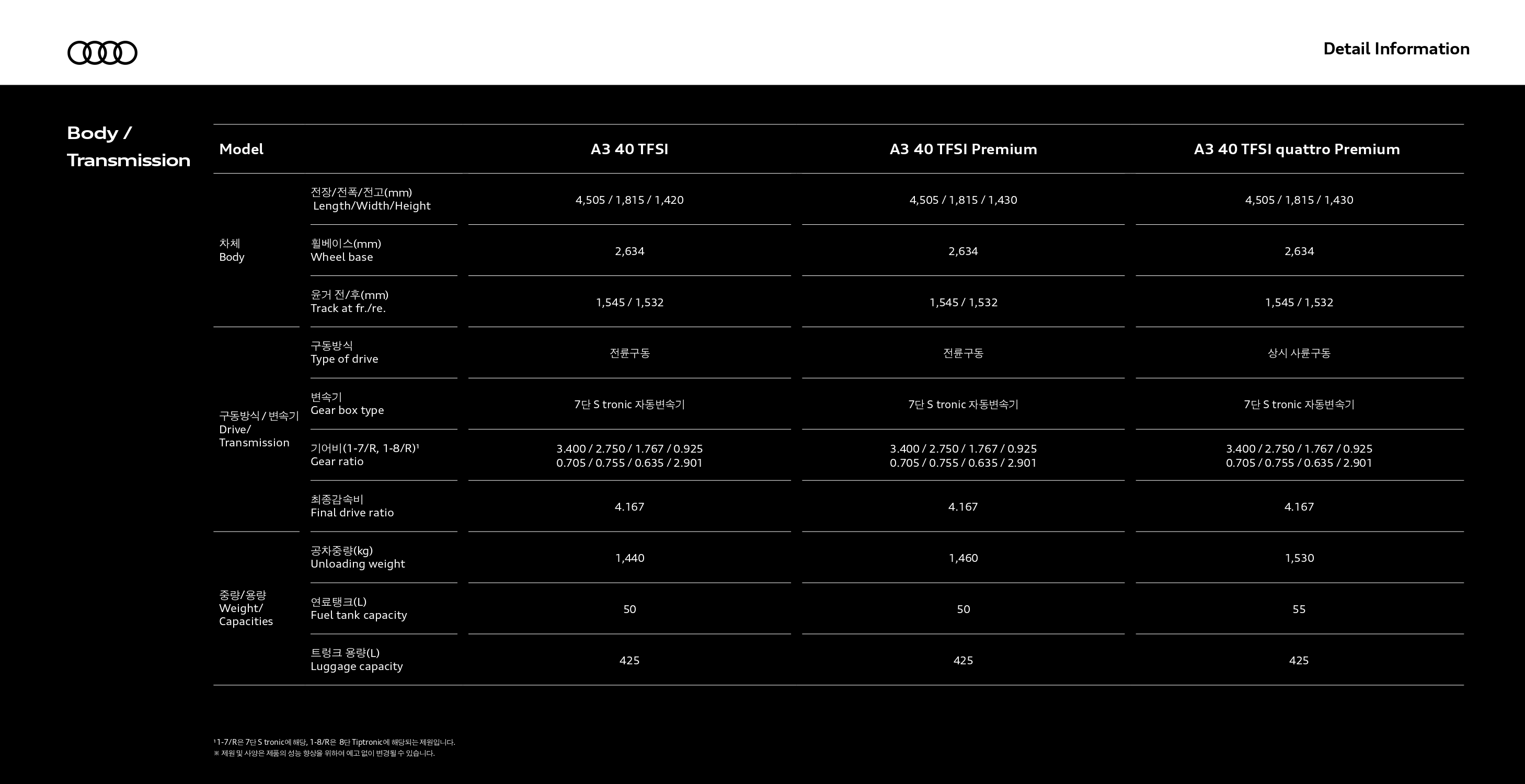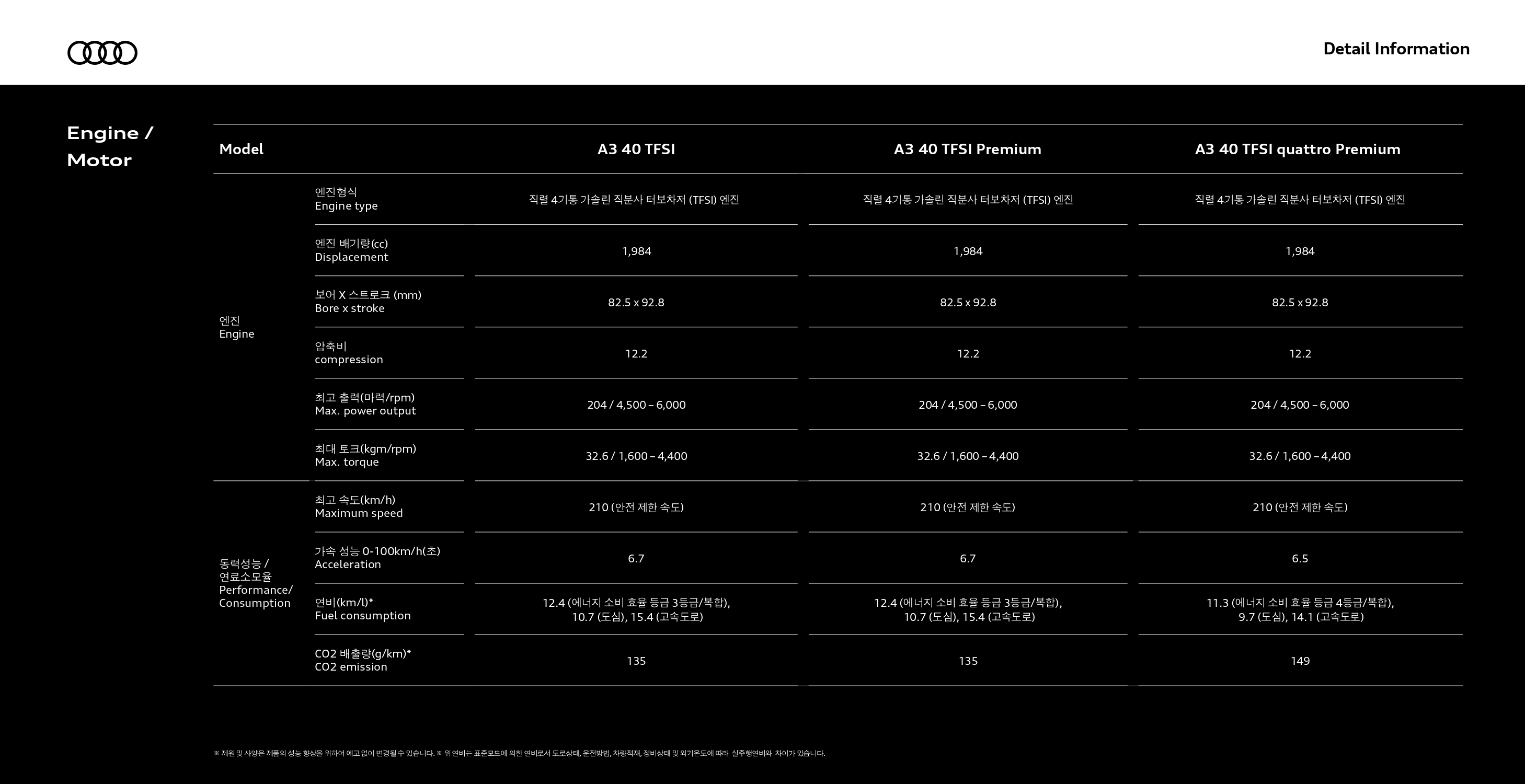 40TFSI 및 40TFSI 프리미엄은 파워트레인이 동일하여 성능은 동일하고, 콰트로 프리미엄이 성능은 좋으나, 연비가 조금 더 떨어집니다.