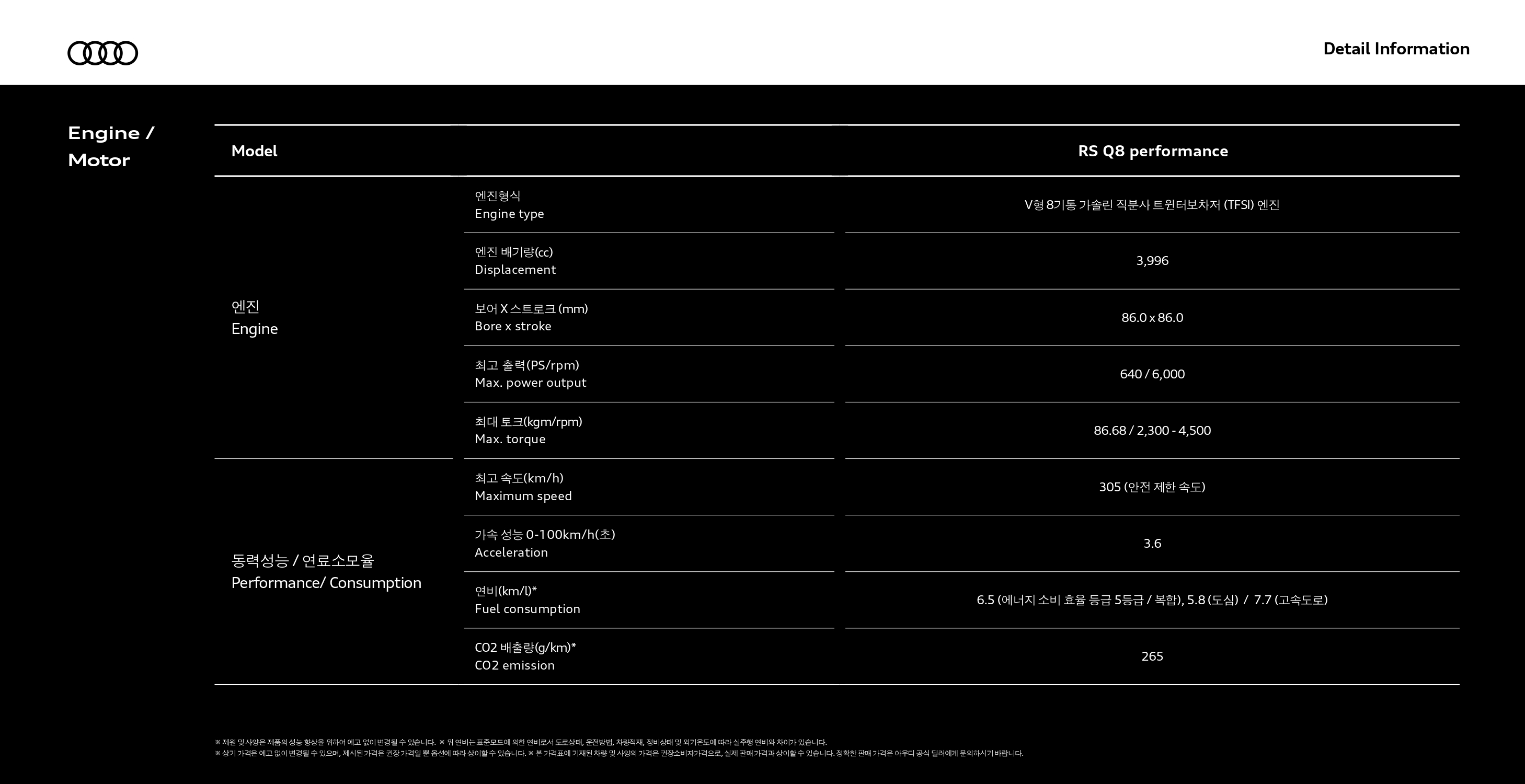 보통 일반 차량이라면, 제원을 자세히 보시는 분들이 없겠지만, RSQ8은 고성능 모델이라, 유심히 보시는 분들이 많을 것 같네요.
