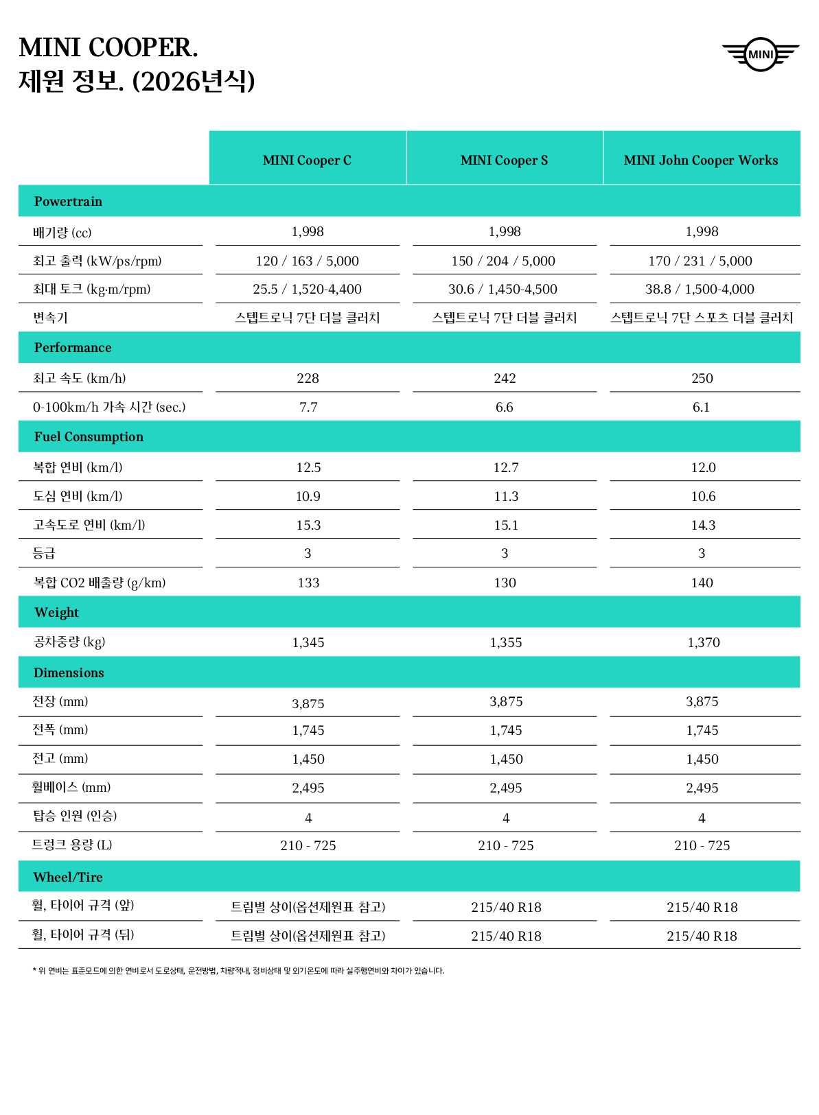 ▼ 2026 미니 쿠퍼 3도어 제원 ▼