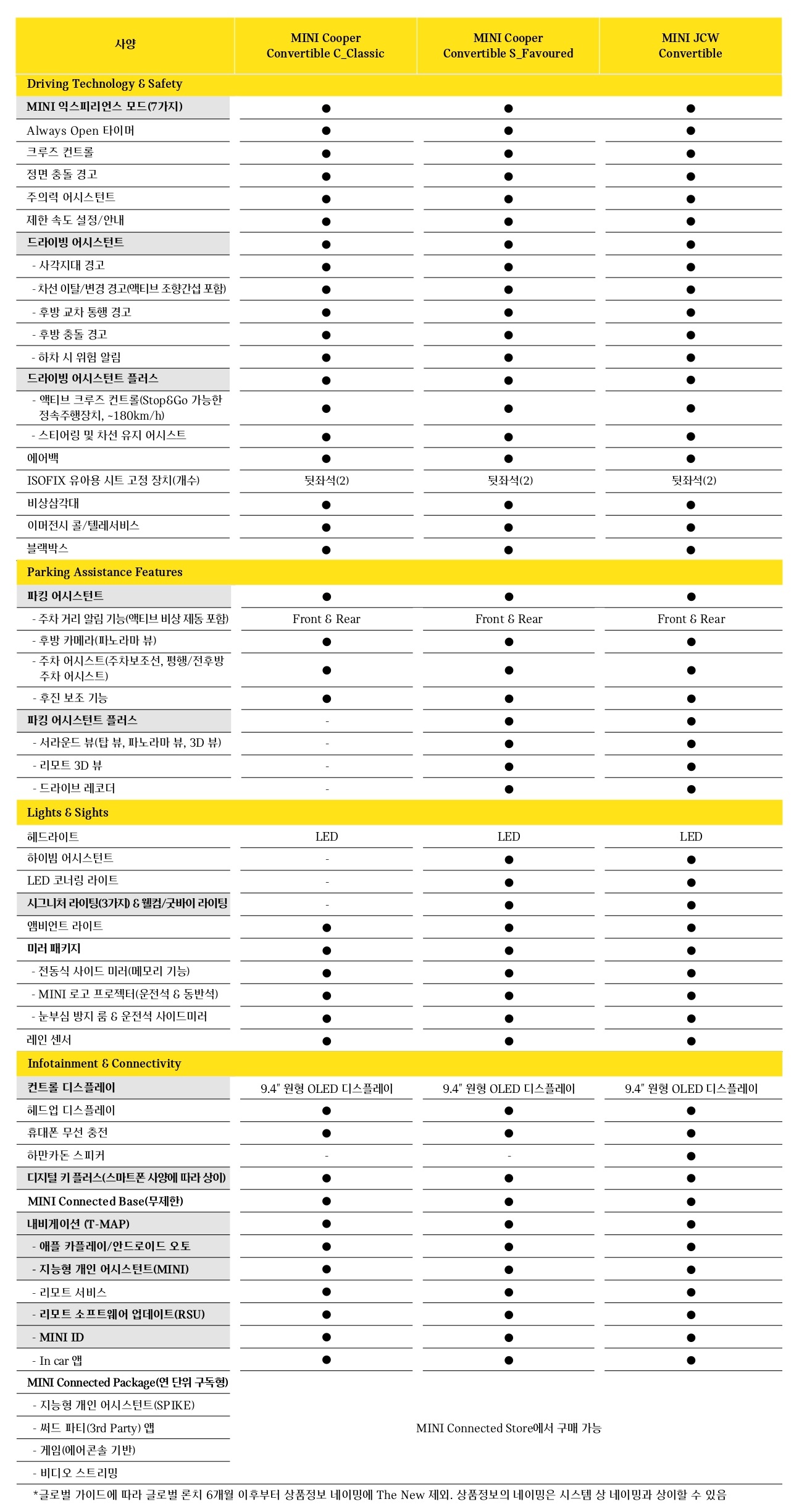 아래는 26년식 미니 쿠퍼 컨버터블 옵션표 및 제원표인데, 25년식 정보도 포함되어 있습니다.