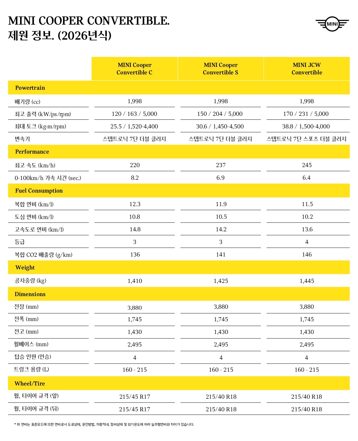 ▼ 2026 미니쿠퍼 컨버터블 제원 ▼