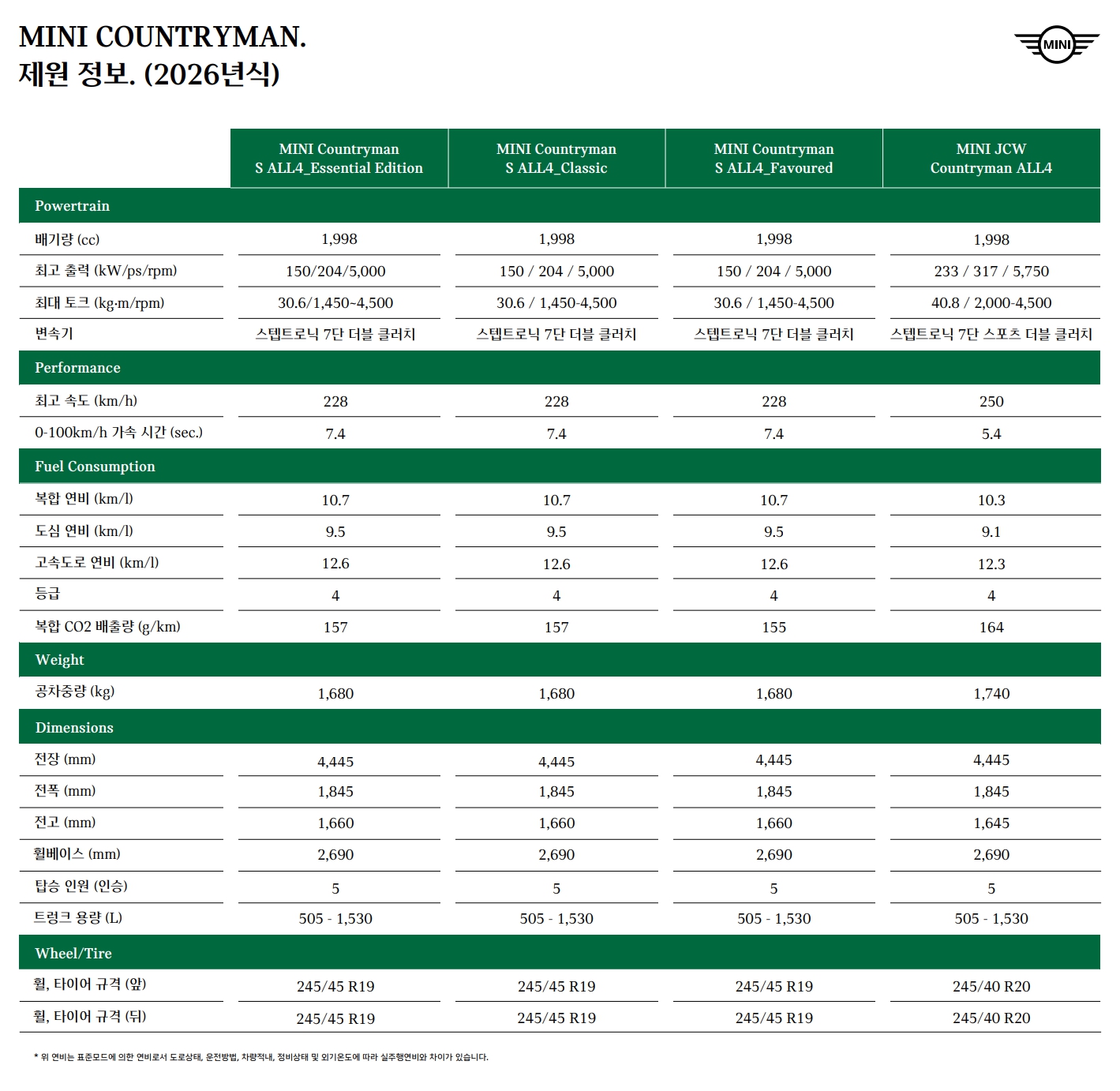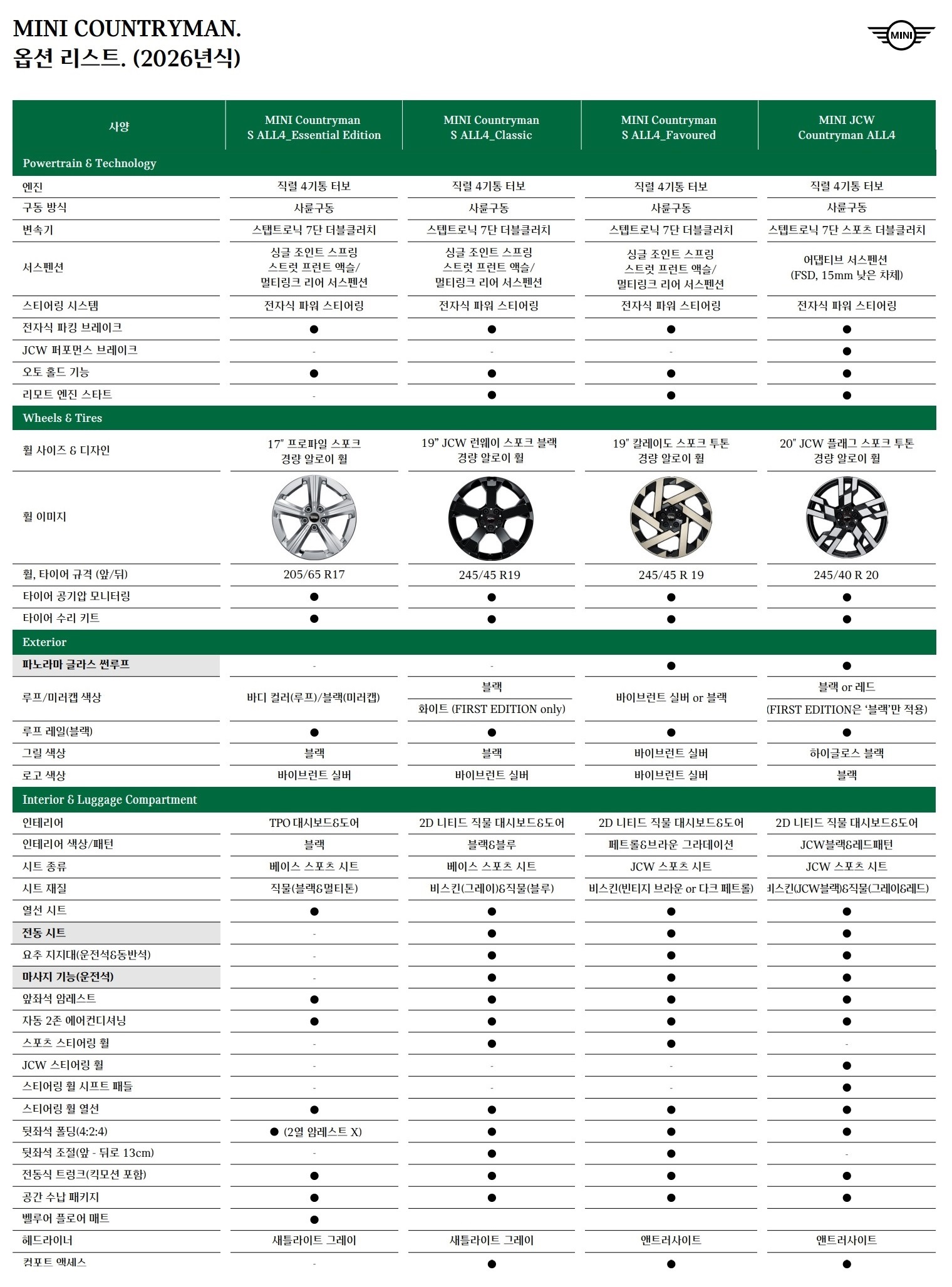 아래에 26년식 미니 컨트리맨 옵션 표 및 제원표 원본 PDF 파일 공유드립니다.