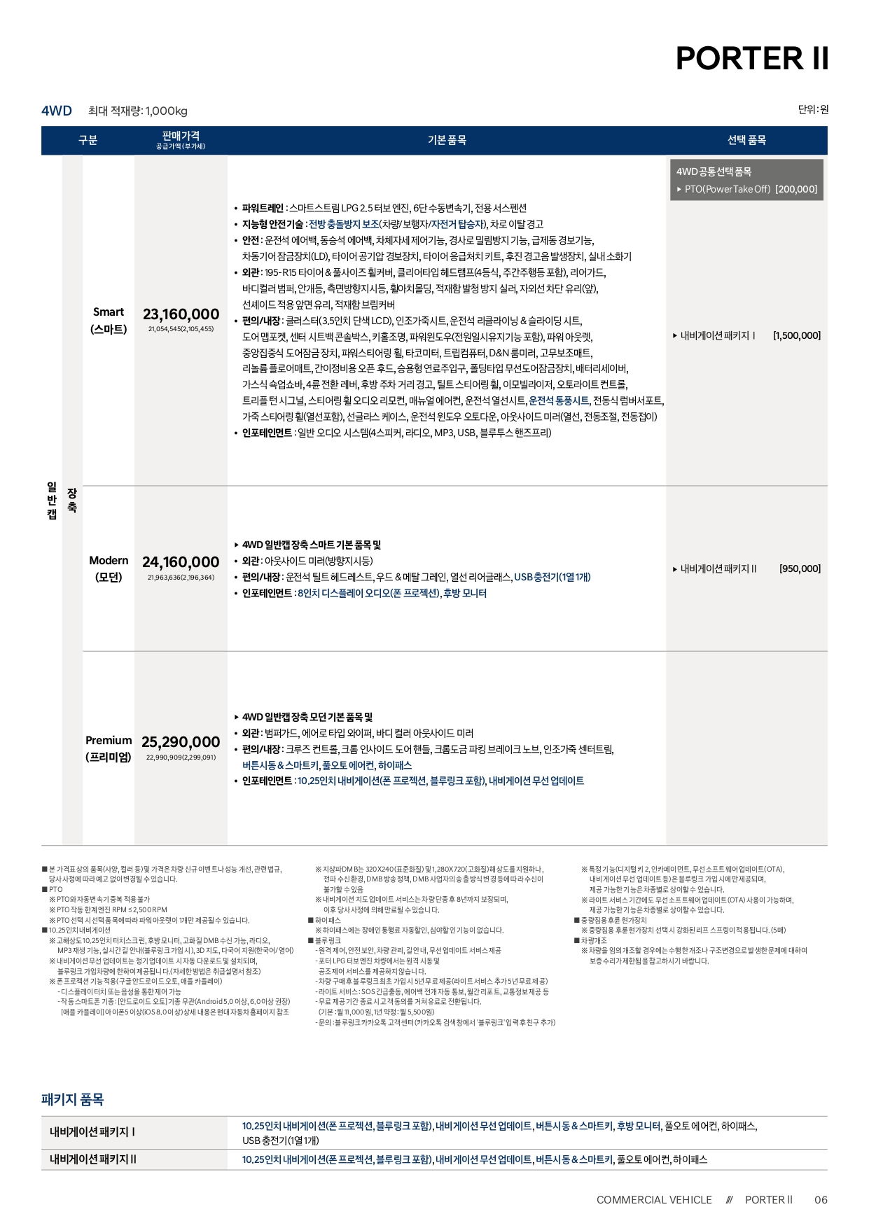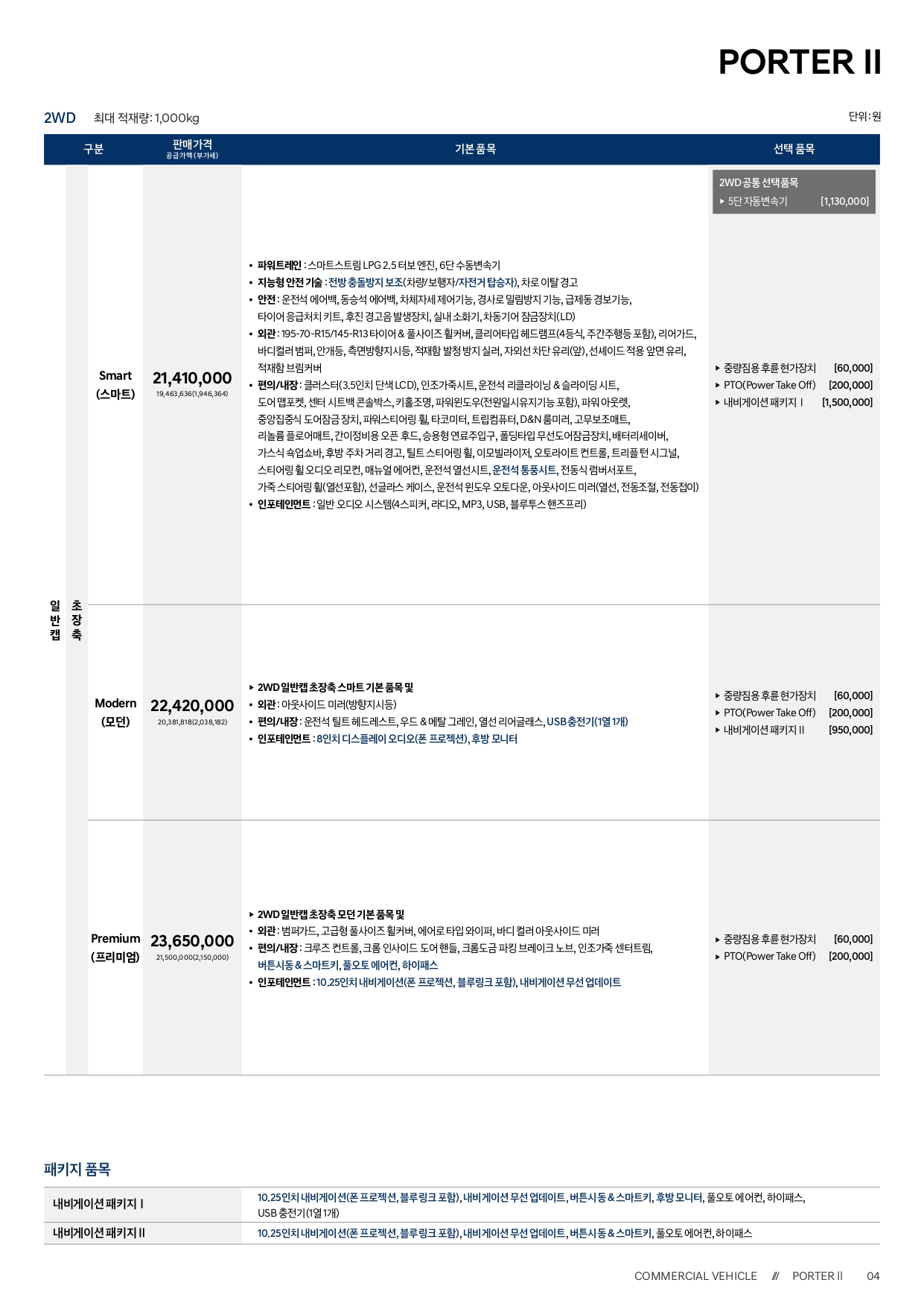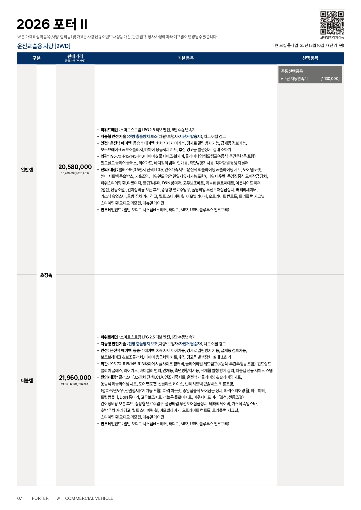 포터 LPG 모델과는 달리, 트림 및 옵션 구성이 그대로 유지가 되어, 가격 인상폭 또한 전 트림 25만원 동일합니다.