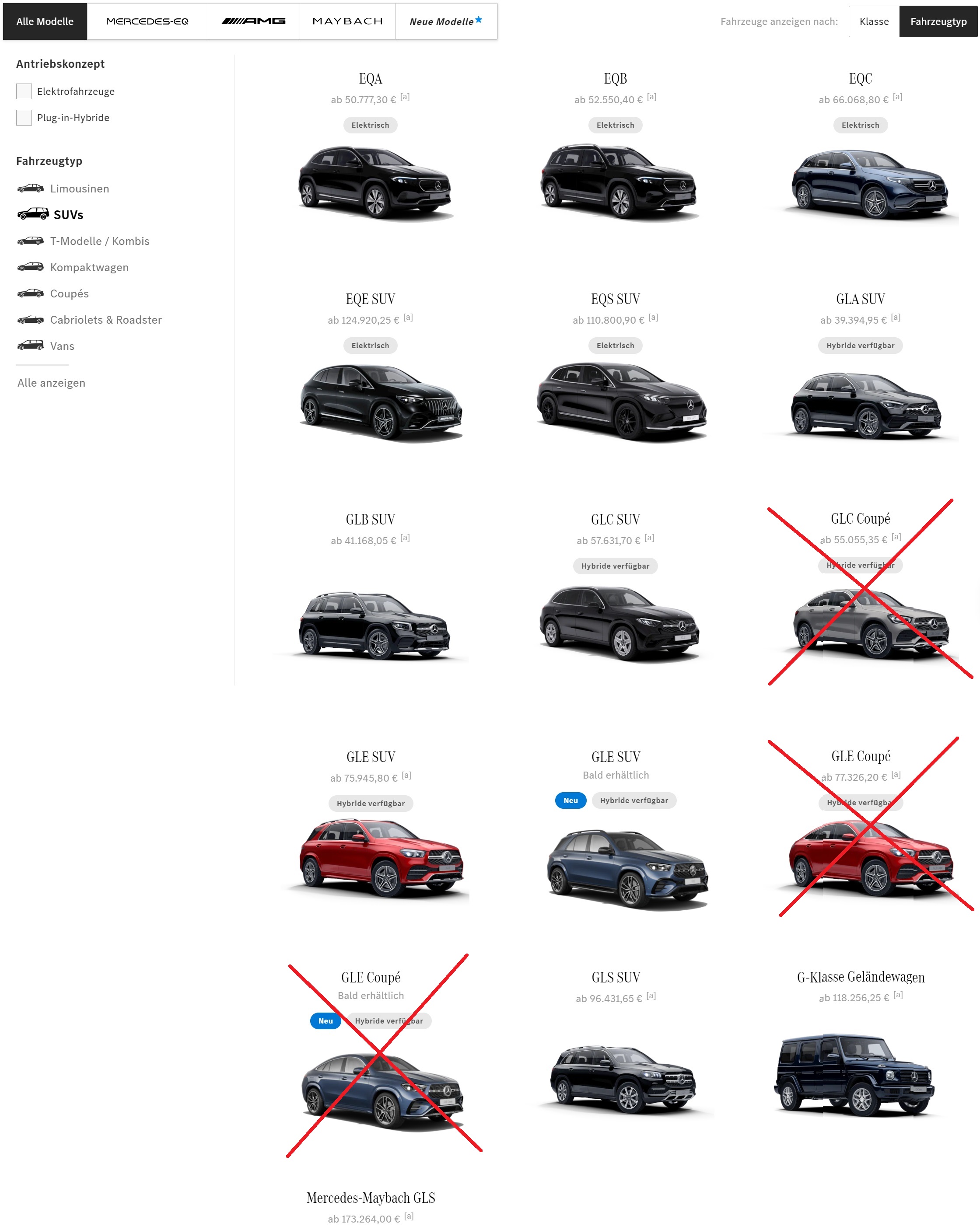 GLC 쿠페 및 GLE 쿠페가 단종이 예상됩니다. GLC의 경우, 최근 풀체인지를 마친지 얼마 안 되었기 때문에 그나마 오래 버티겠지만, GLE 쿠페는 최근 페이스리프트만 마친 상황이라 더 빨리 단종될 것으로 예상됩니다.