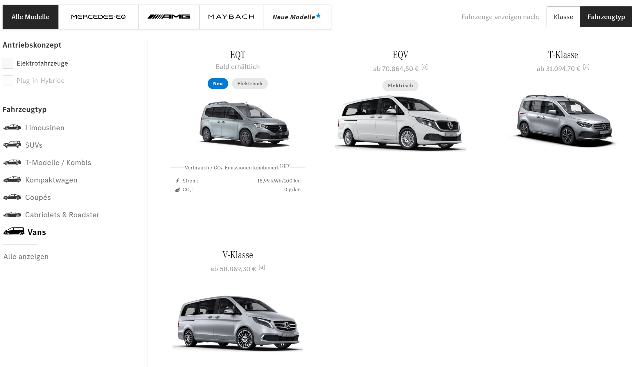 마지막으로 미니밴 라인업입니다. 미니밴이라 해봐야 사실 T클래스와 V클래스 두 종류뿐이고, 나머지 두 차종은 내연기관을 전기차로 개조한 차량에 불과합니다.