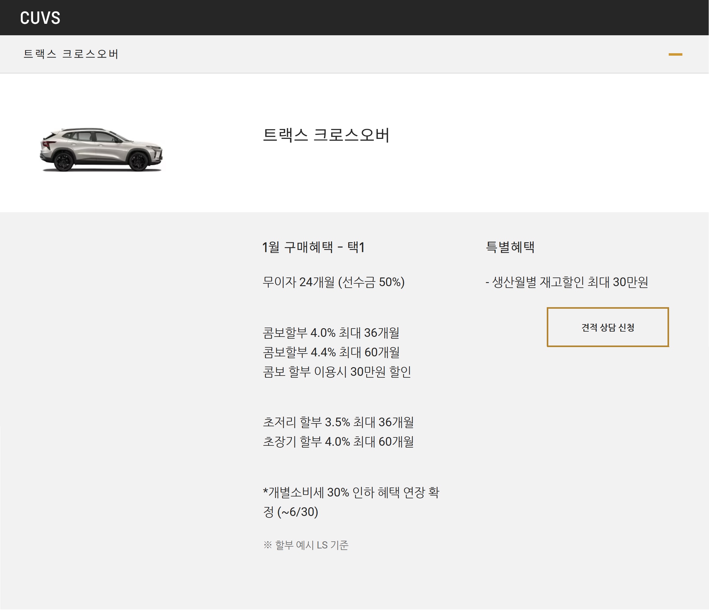 트랙스와는 달리, 무이자 할부 상품은 없고, 콤보 하부 상품만 있습니다.