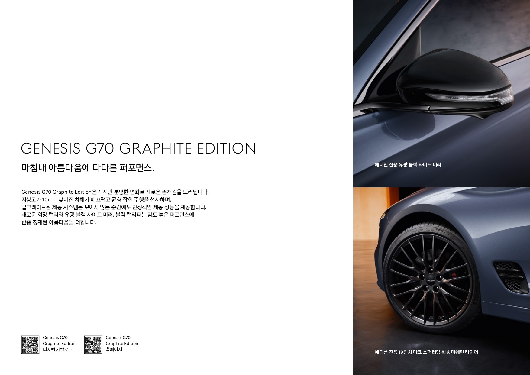 기존 제네시스 라인업이나, 현대 라인업은 최근에 블랙 컬러를 강조하는 추세인데, G70은 럭셔리 보다는 스포티에 초점을 맞추어 그래파이트 색상을 선택한 것으로 추측됩니다.