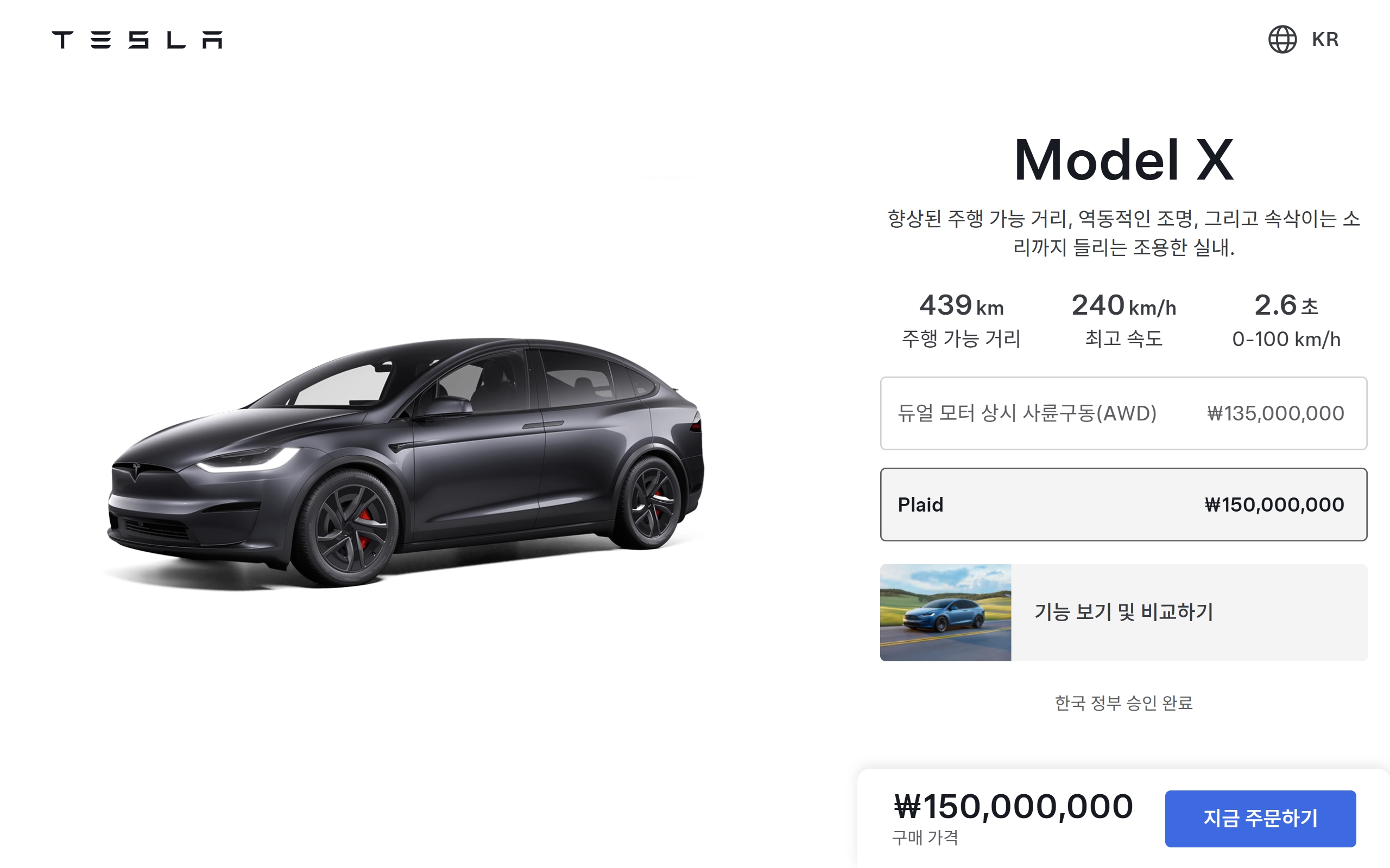 모델 X 상시 사륜구동(AWD) : 1억 3,500 만원